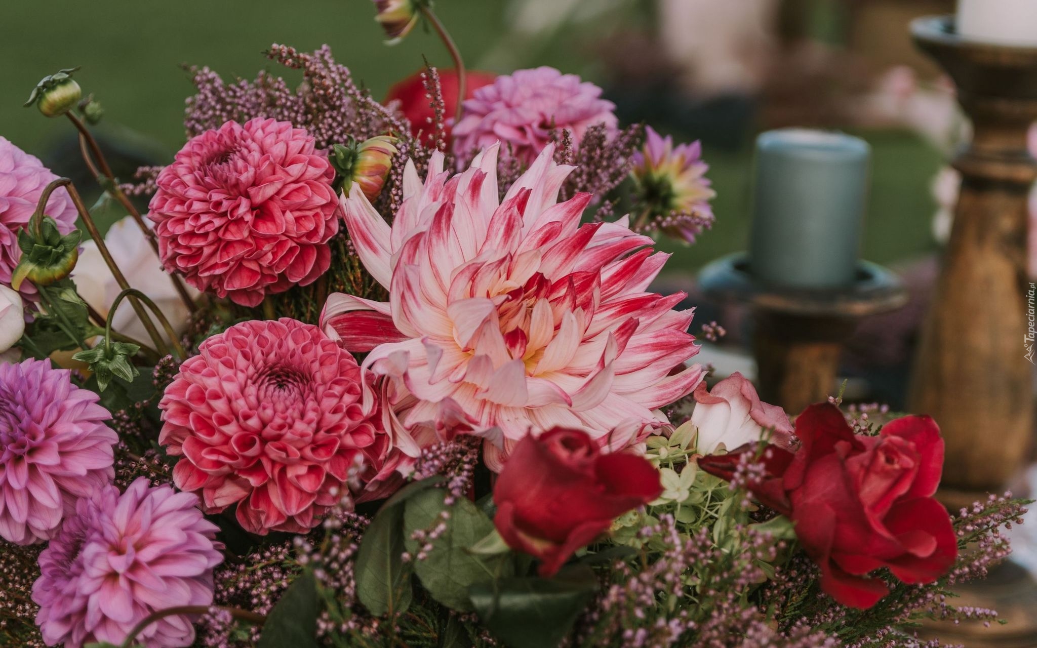Edytor tapety: Bukiet róż i dalii z wrzosami
