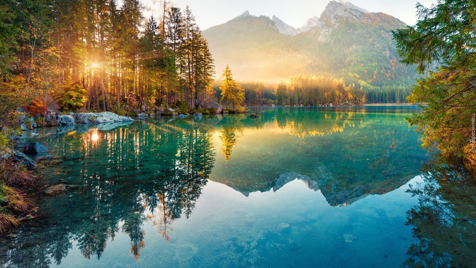 Edytor tapety: Rozświetlone góry i las nad jeziorem