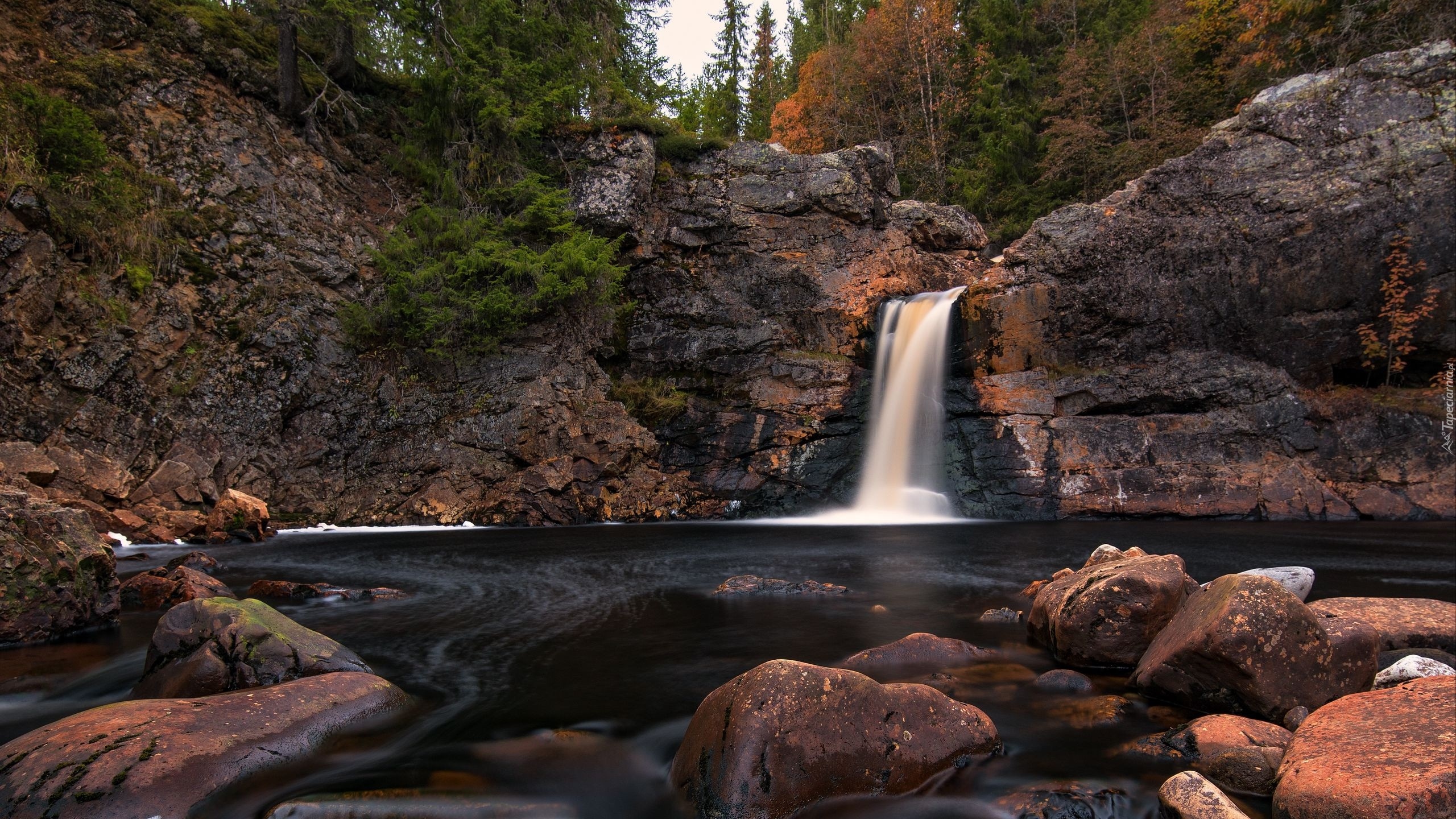 Edytor tapety: Jesienne drzewa na skałach przy wodospadzie