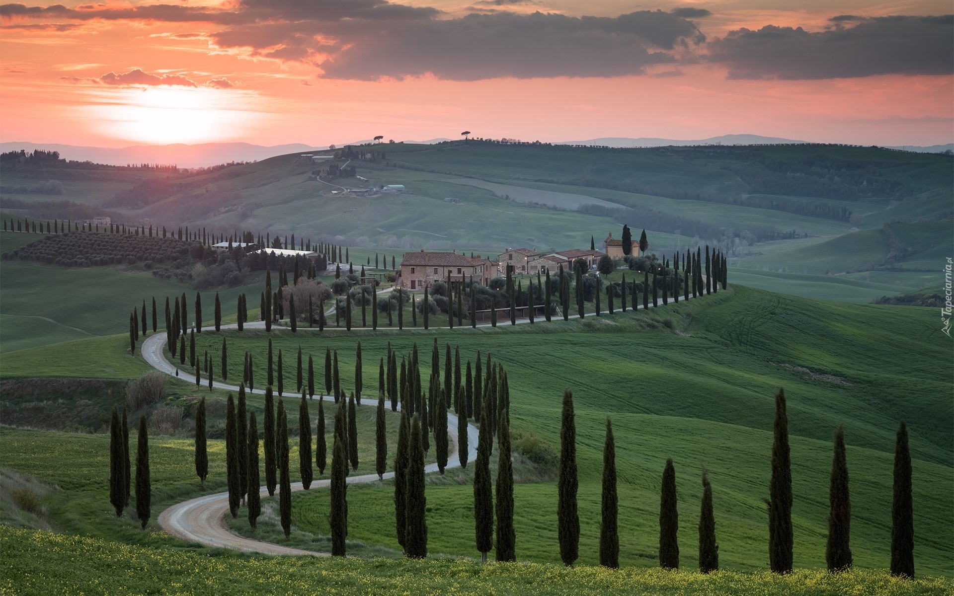 Edytor tapety: Cyprysy przy krętej drodze na zielonych wzgórzach Toskanii