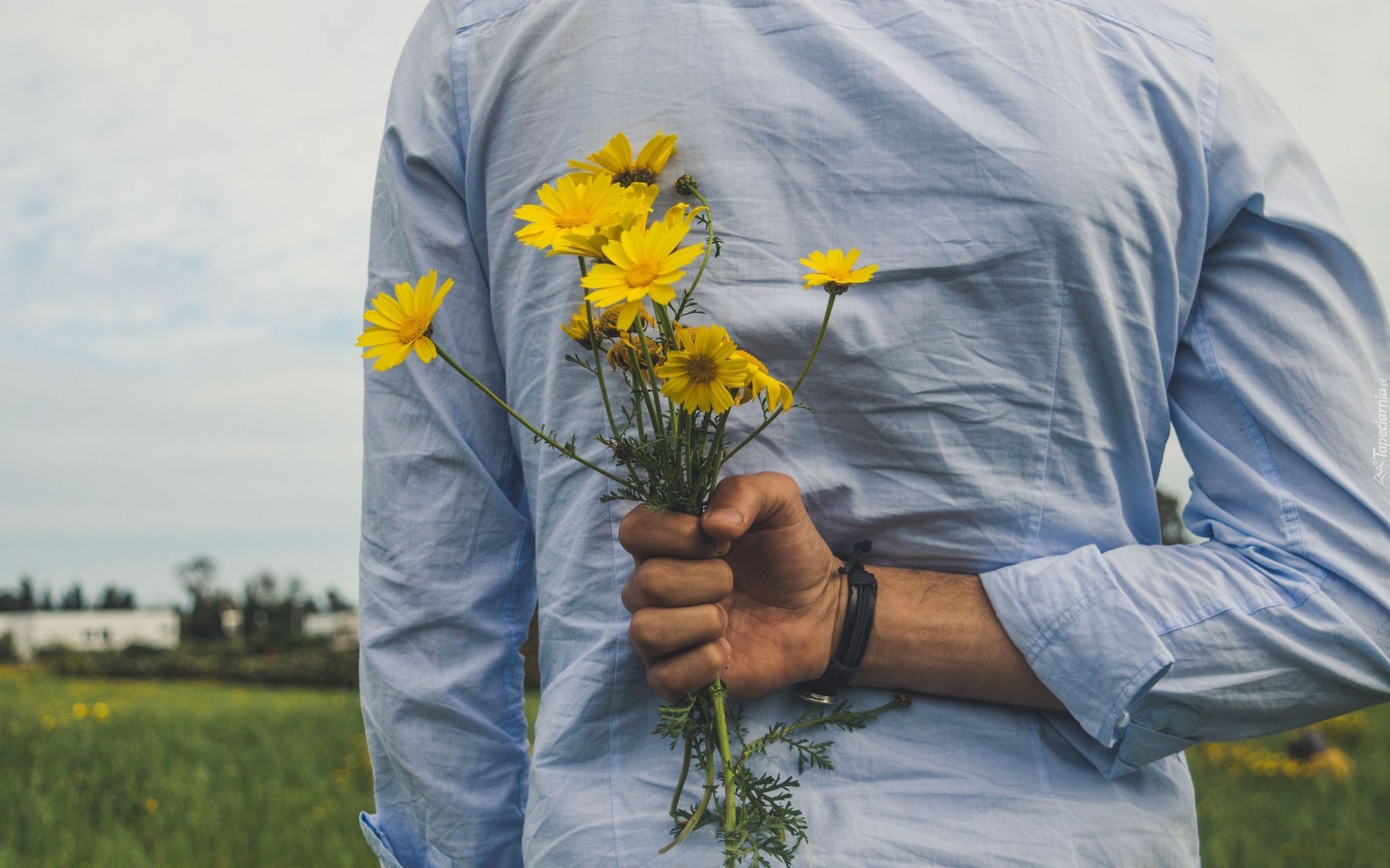 Edytor tapety: Mężczyzna z polnymi kwiatami w ręce za plecami