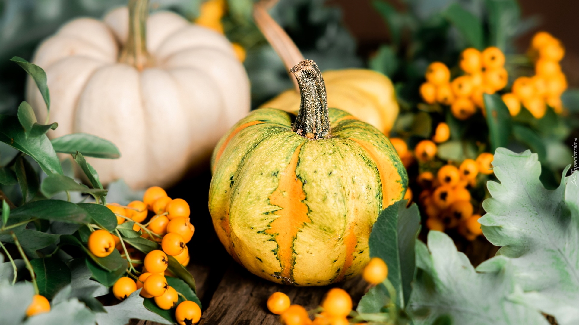Edytor tapety: Dynie pośród liści i owoców ognika szkarłatnego