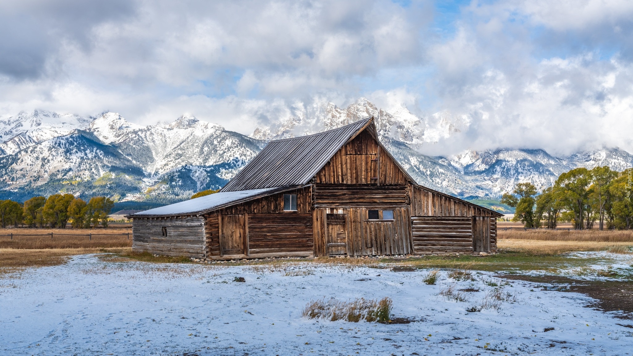 Edytor tapety: Drewniana stodoła na tle ośnieżonych gór Teton Range