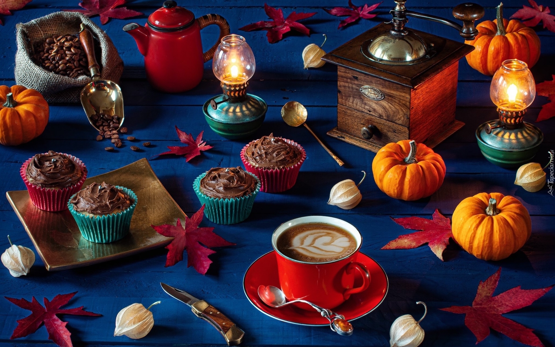Edytor tapety: Babeczki i dynie obok młynka i filiżanki kawy