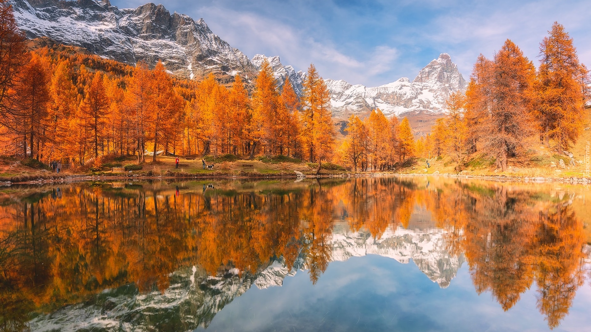 Edytor tapety: Odbicie ośnieżonych gór i jesiennych drzew w jeziorze