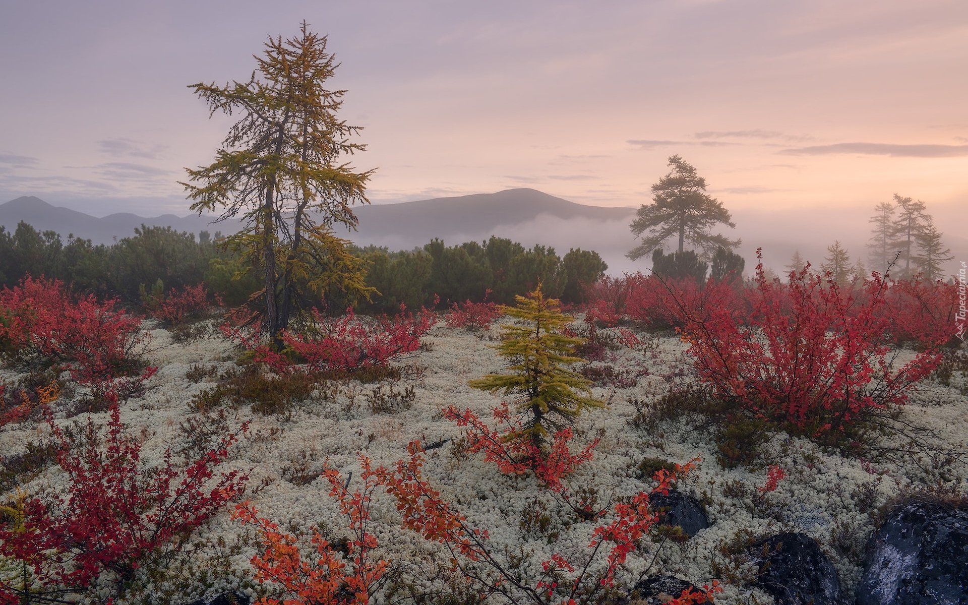 Edytor tapety: Drzewa i kolorowa roślinność na tle zamglonych gór
