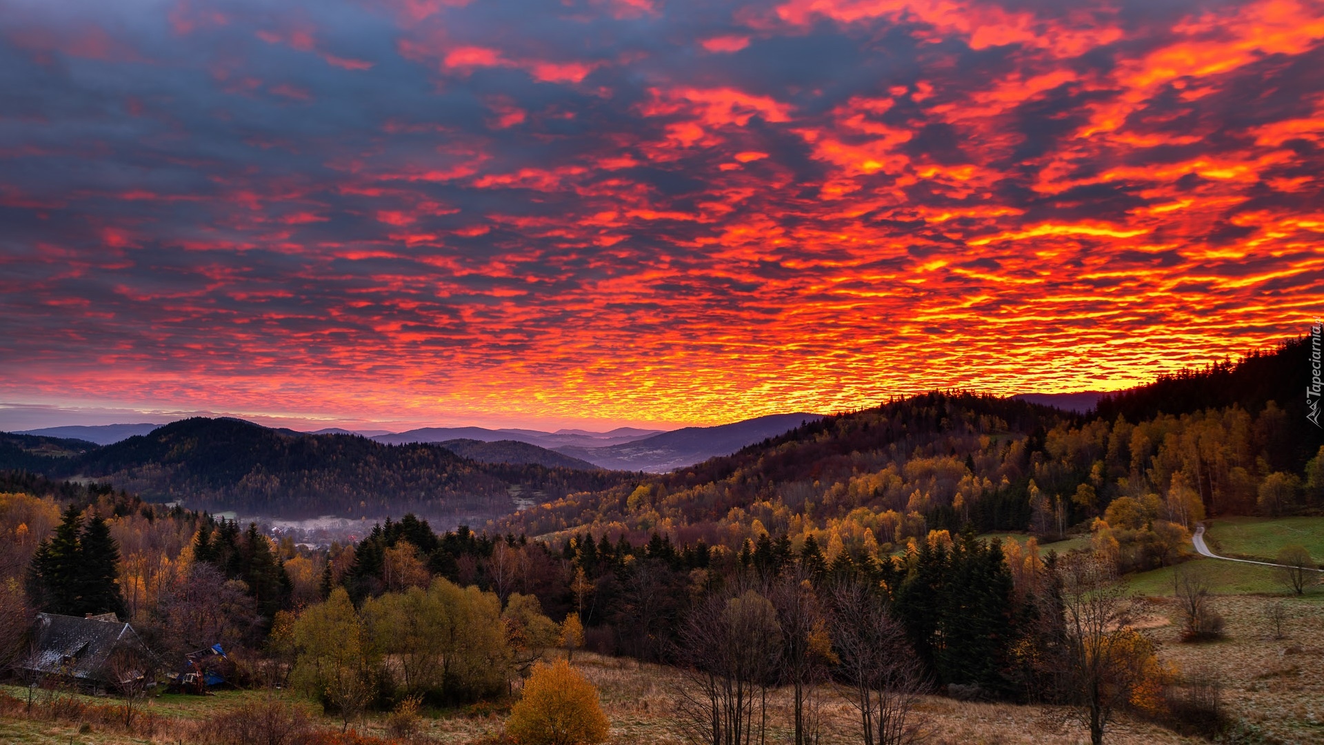 Edytor tapety: Kolorowy wschód słońca nad zalesionymi górami