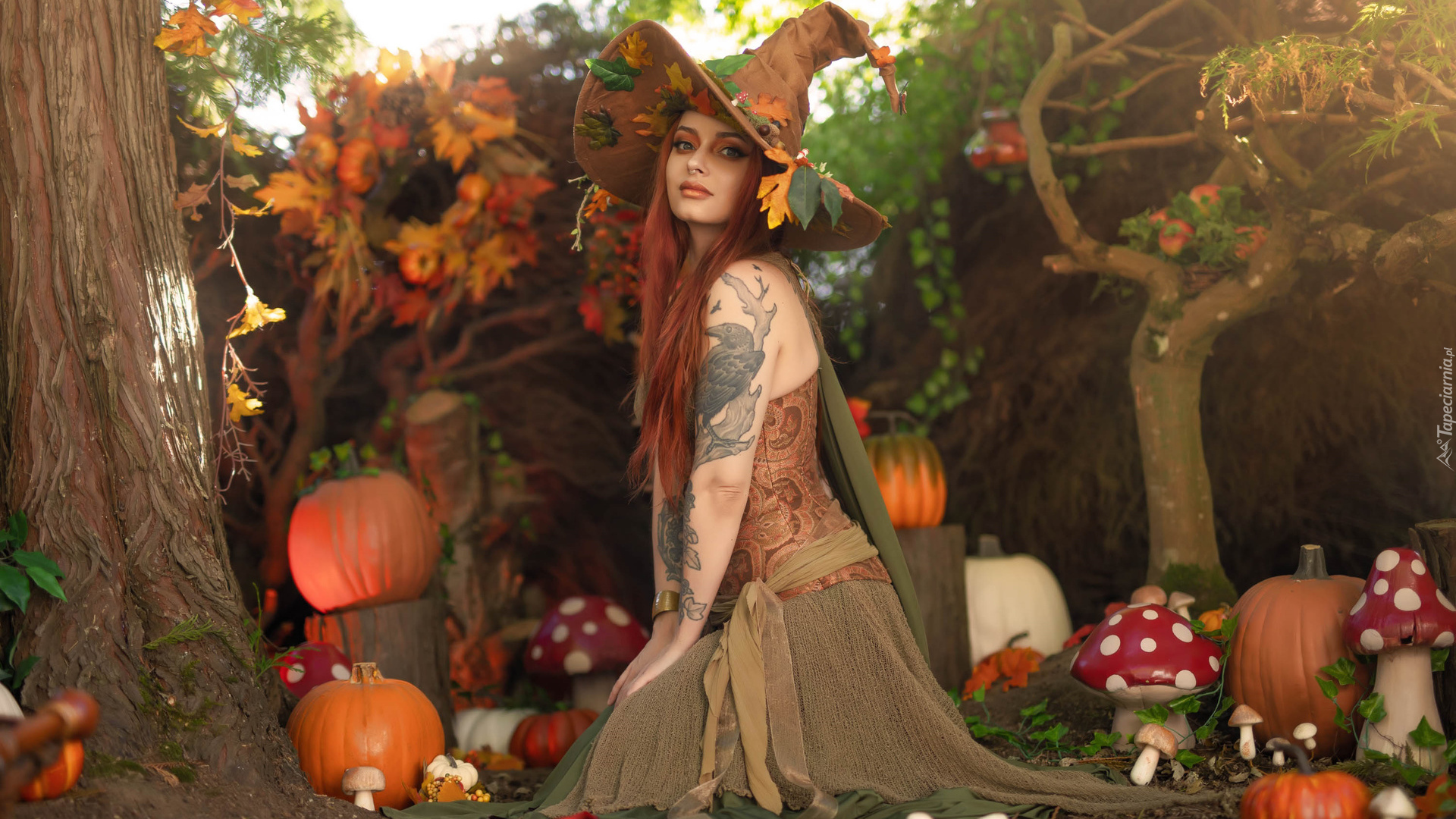 Edytor tapety: Kobieta w przebraniu czarownicy w halloweenowej scenerii