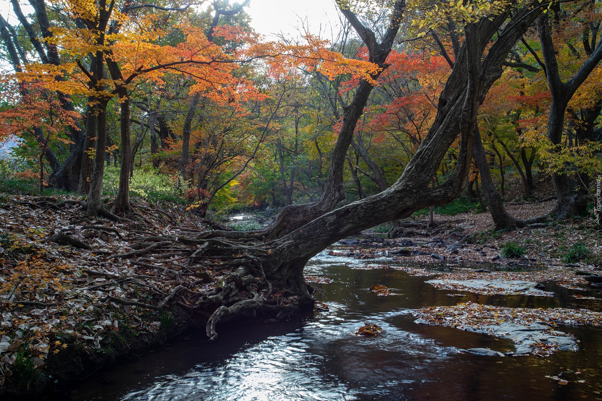 Edytor tapety: Pochylone drzewa nad rzeką w jesiennym lesie