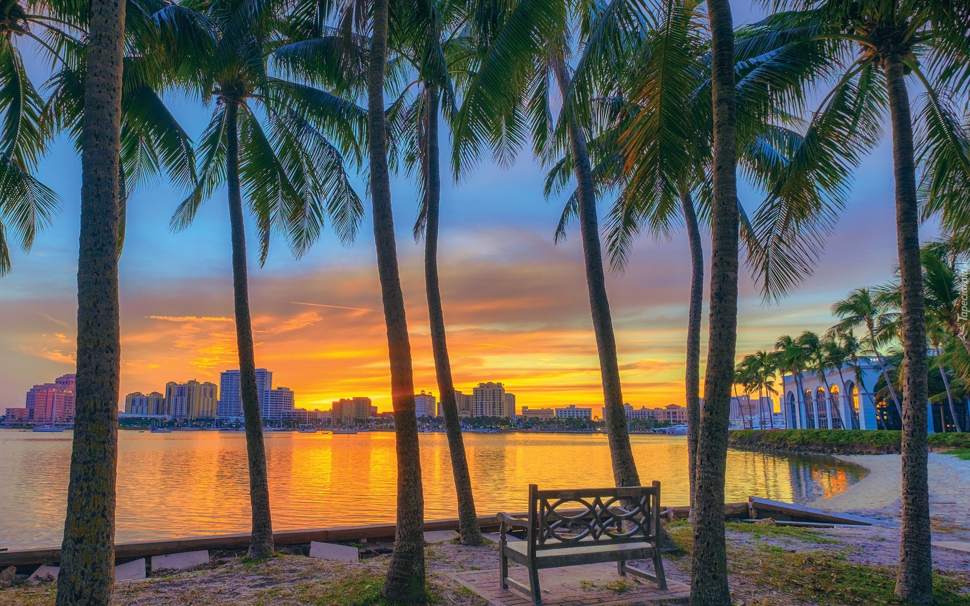 Edytor tapety: Ławka pod palmami z widokiem na zatokę