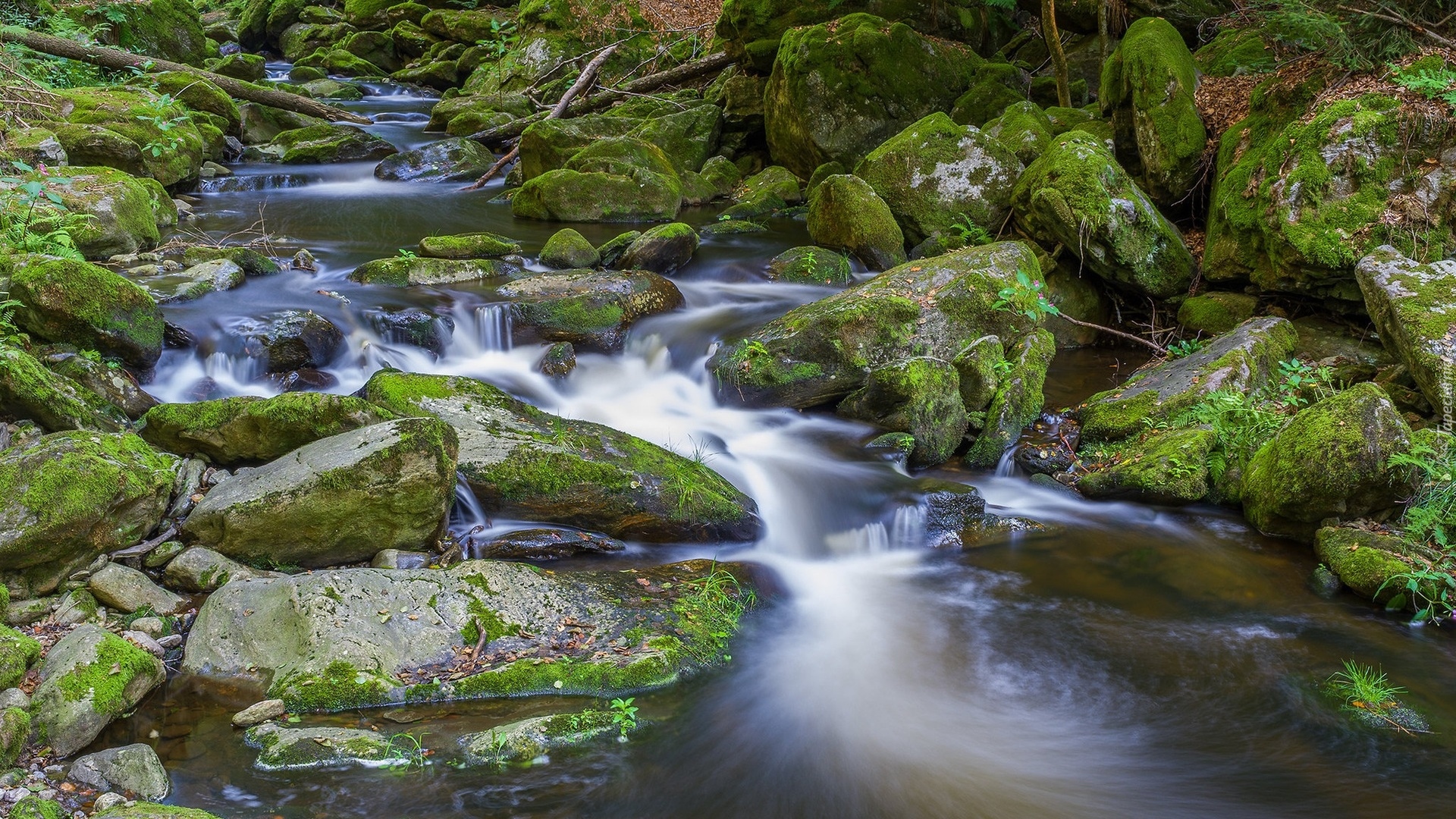 Edytor tapety: Omszałe kamienie na brzegach leśnej rzeki