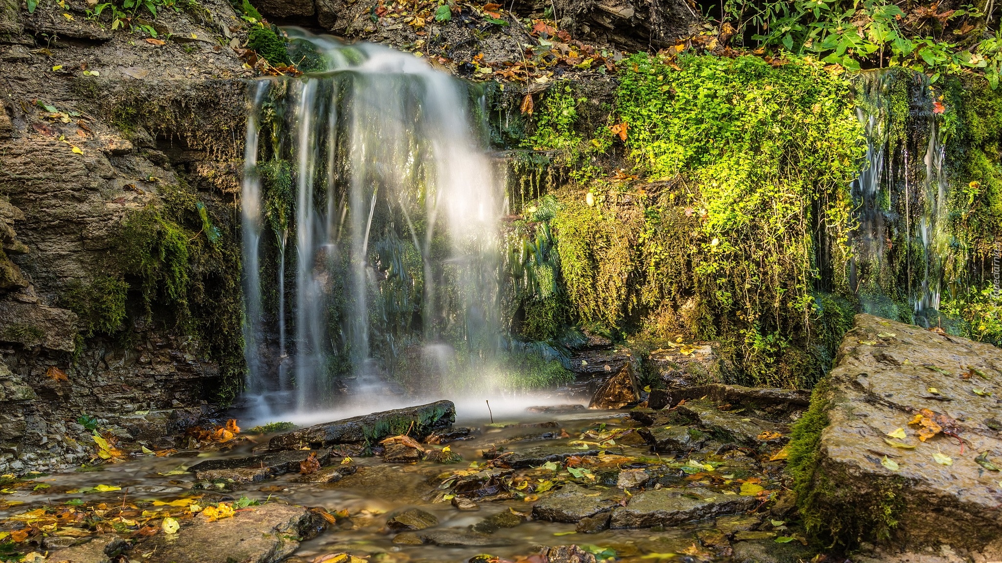 Edytor tapety: Strumyk wpadający do rzeki ze skalnego progu