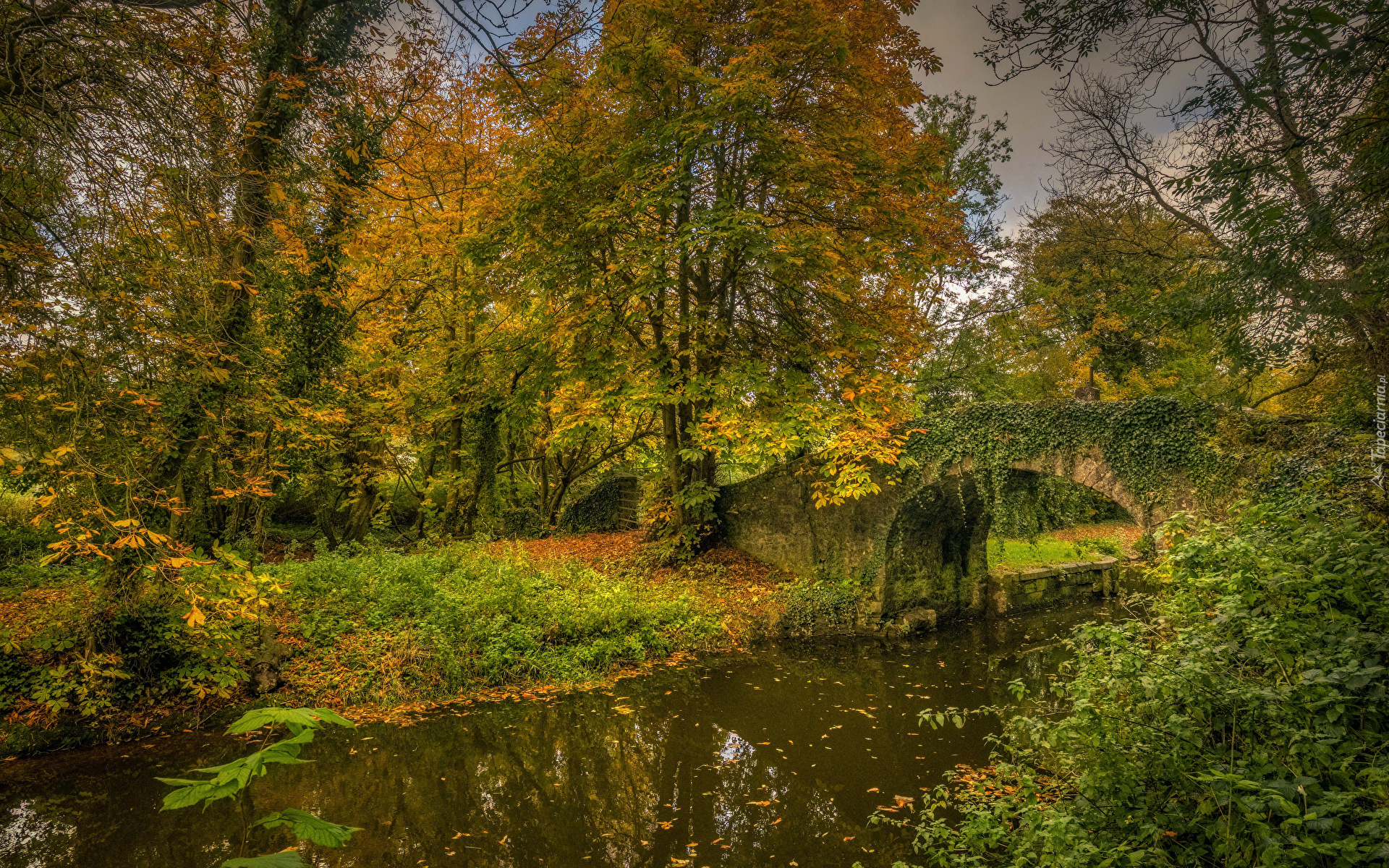 Edytor tapety: Drzewa przy kamiennym moście porośniętym bluszczem nad rzeką