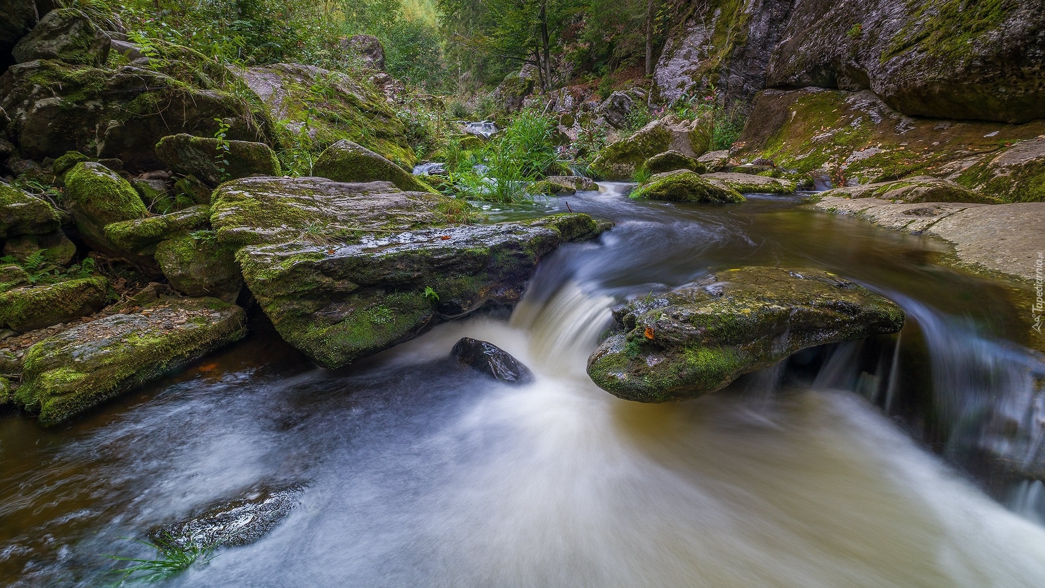 Edytor tapety: Omszałe głazy w rwącej rzece
