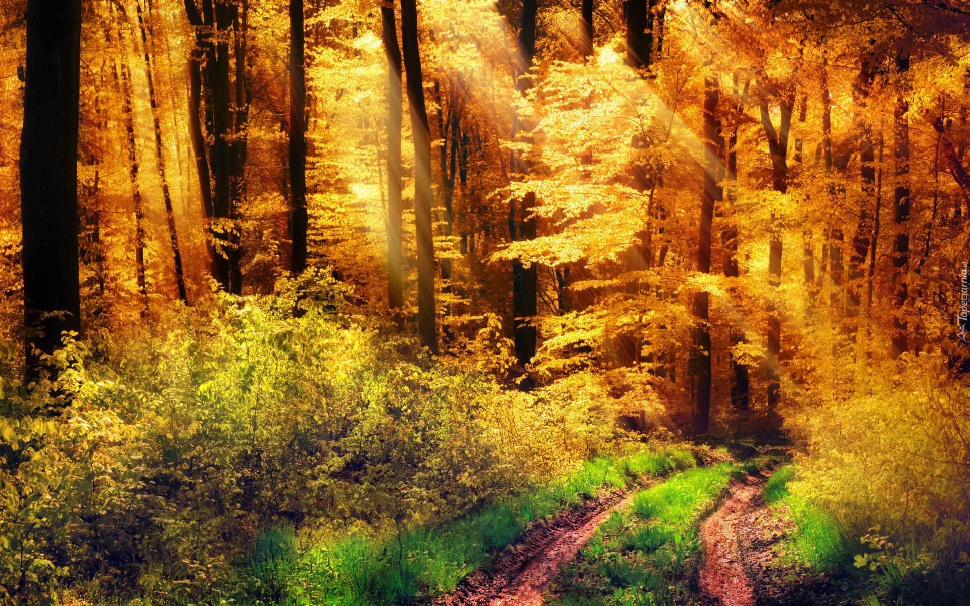 Edytor tapety: Rozświetlone słońcem jesienne drzewa w lesie