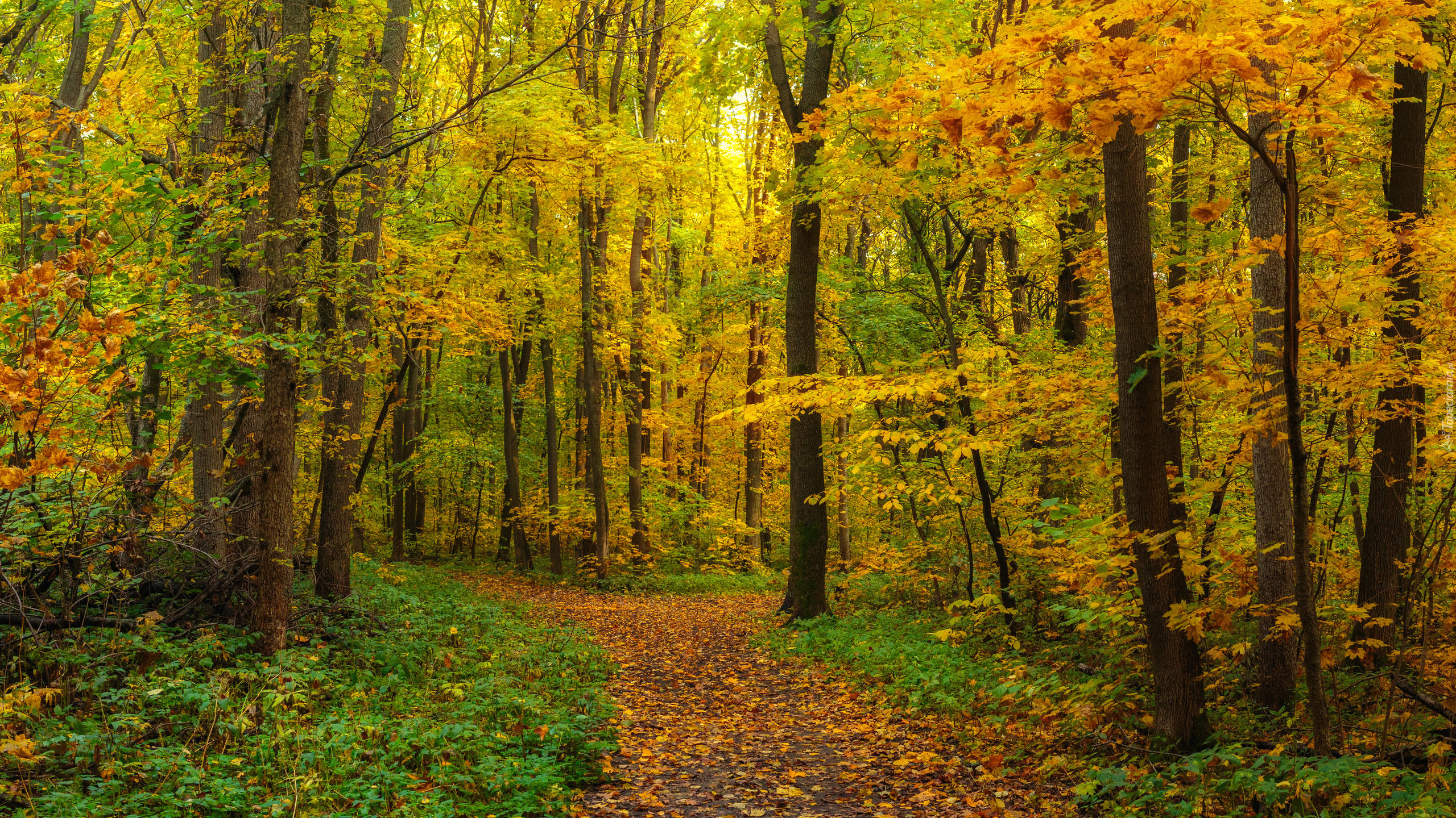 Edytor tapety: Drzewa z pożółkłymi liśćmi przy leśnej ścieżce