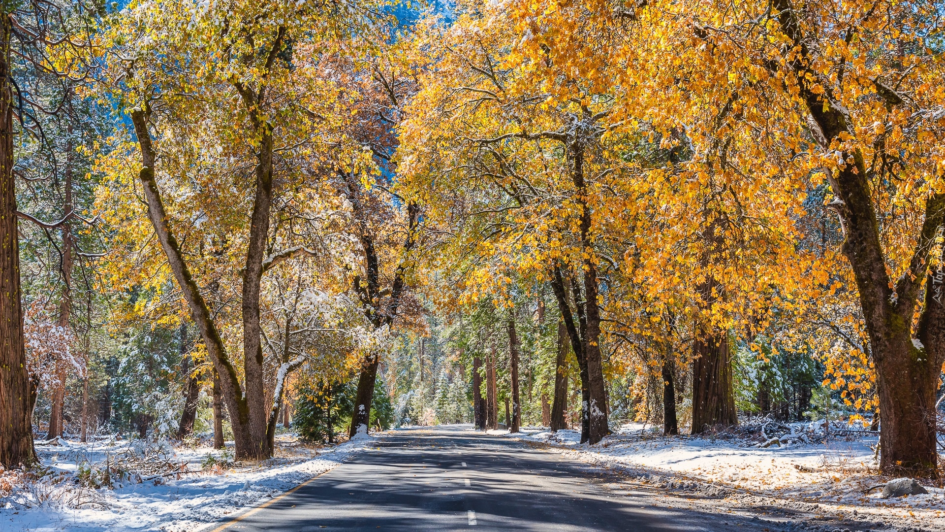 Edytor tapety: Pierwszy śnieg przy drodze pośród jesiennych drzew