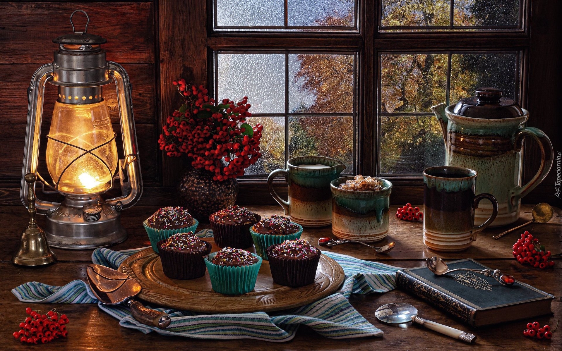 Edytor tapety: Babeczki i lampa przy oknie w jesiennej kompozycji