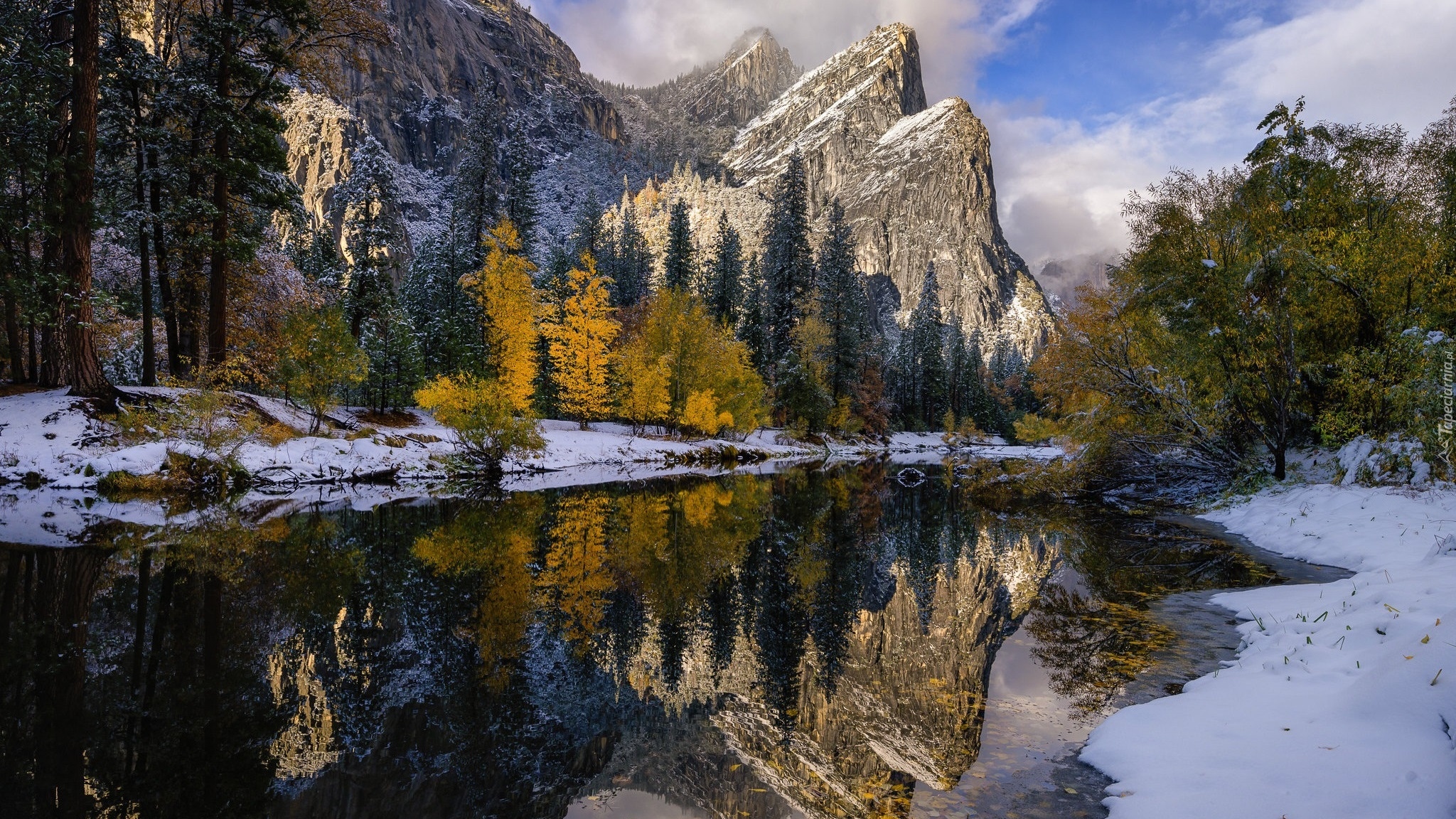 Edytor tapety: Odbicie drzew i górskich szczytów w rzece