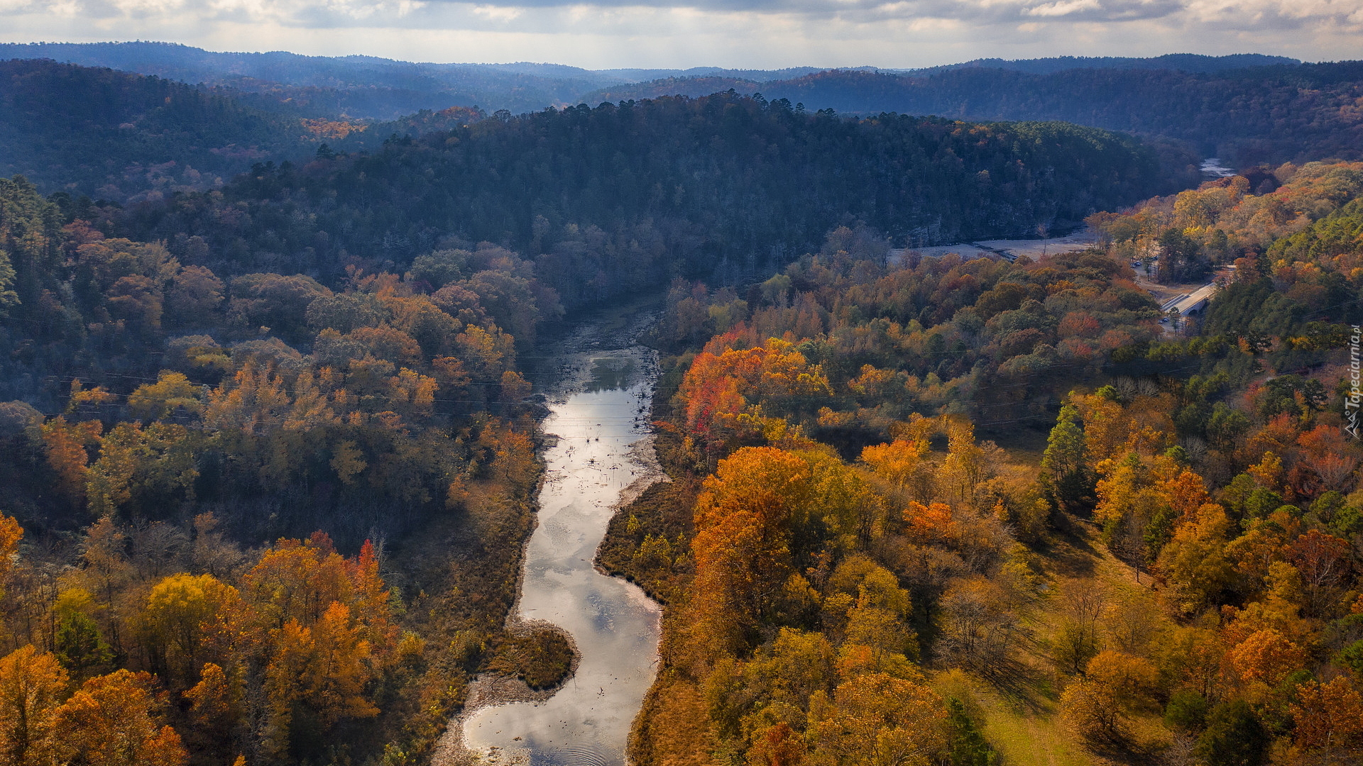 Edytor tapety: Jesienne drzewa wzdłuż rzeki na tle zalesionych wzgórz