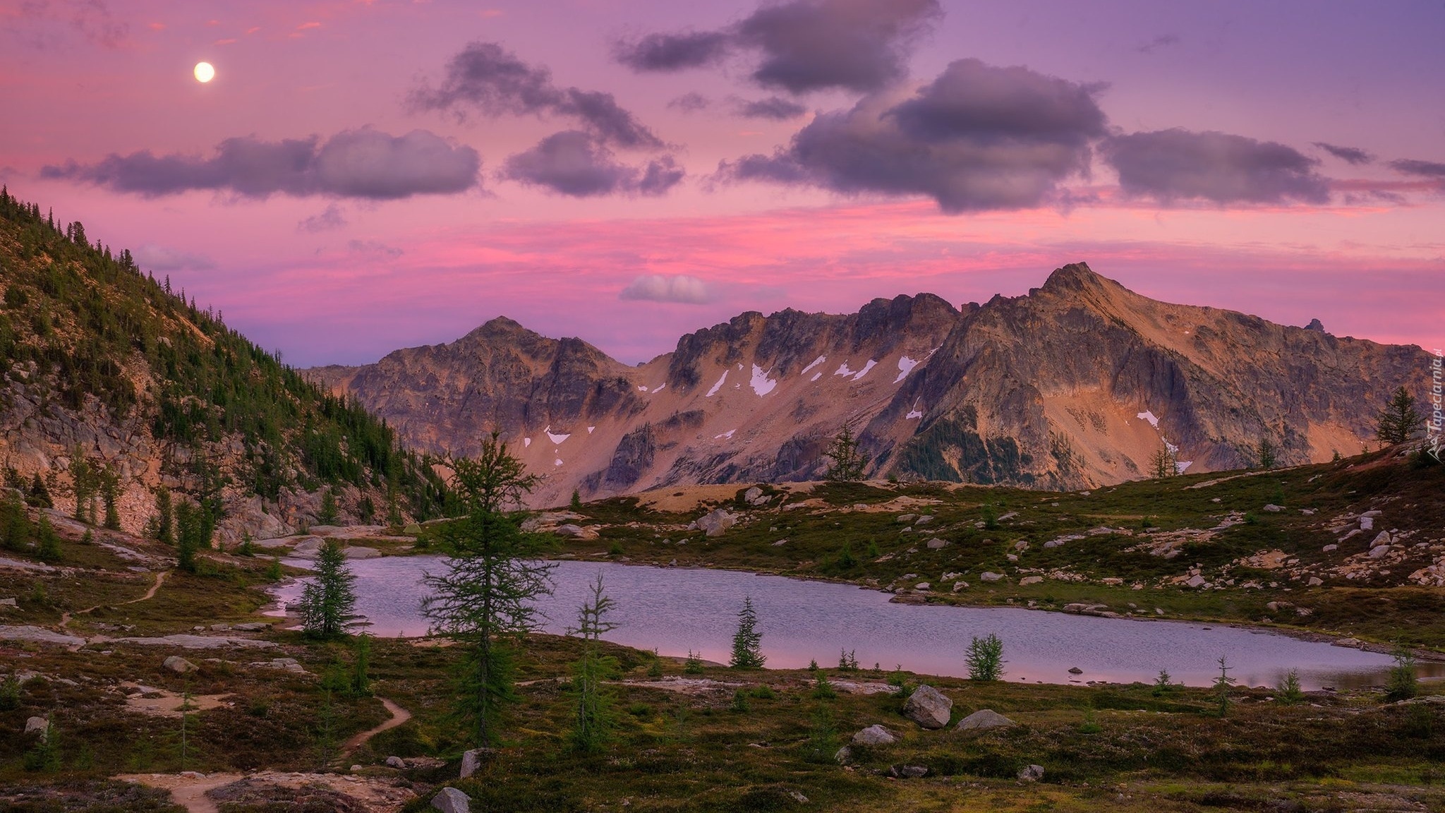 Edytor tapety: Różowe o poranku niebo nad jeziorem i górami