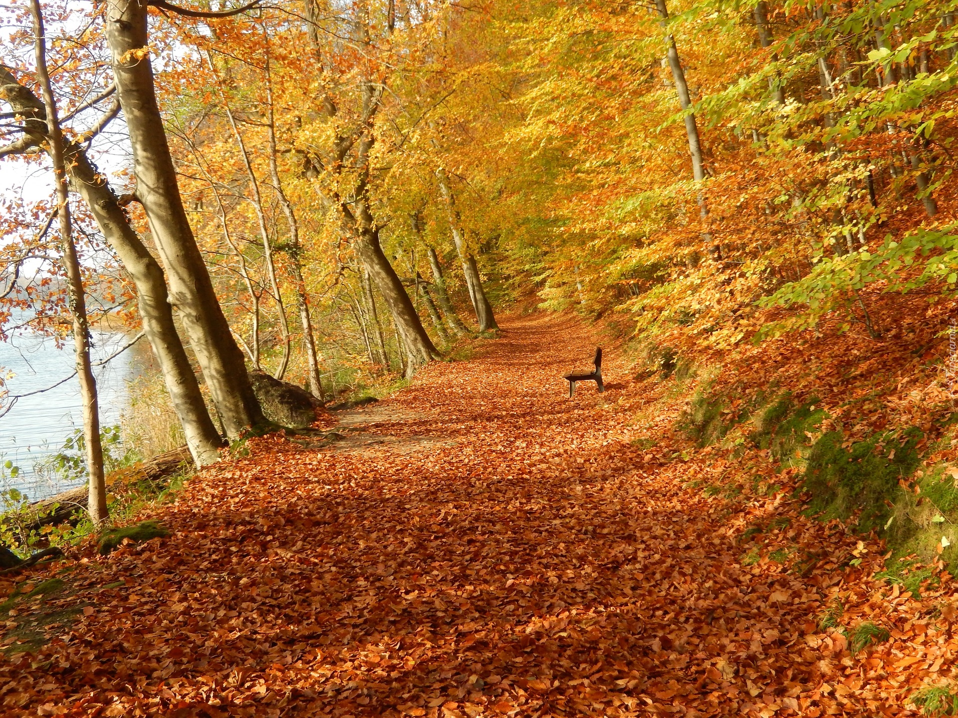 Edytor tapety: Ławka na drodze wśród jesiennych drzew