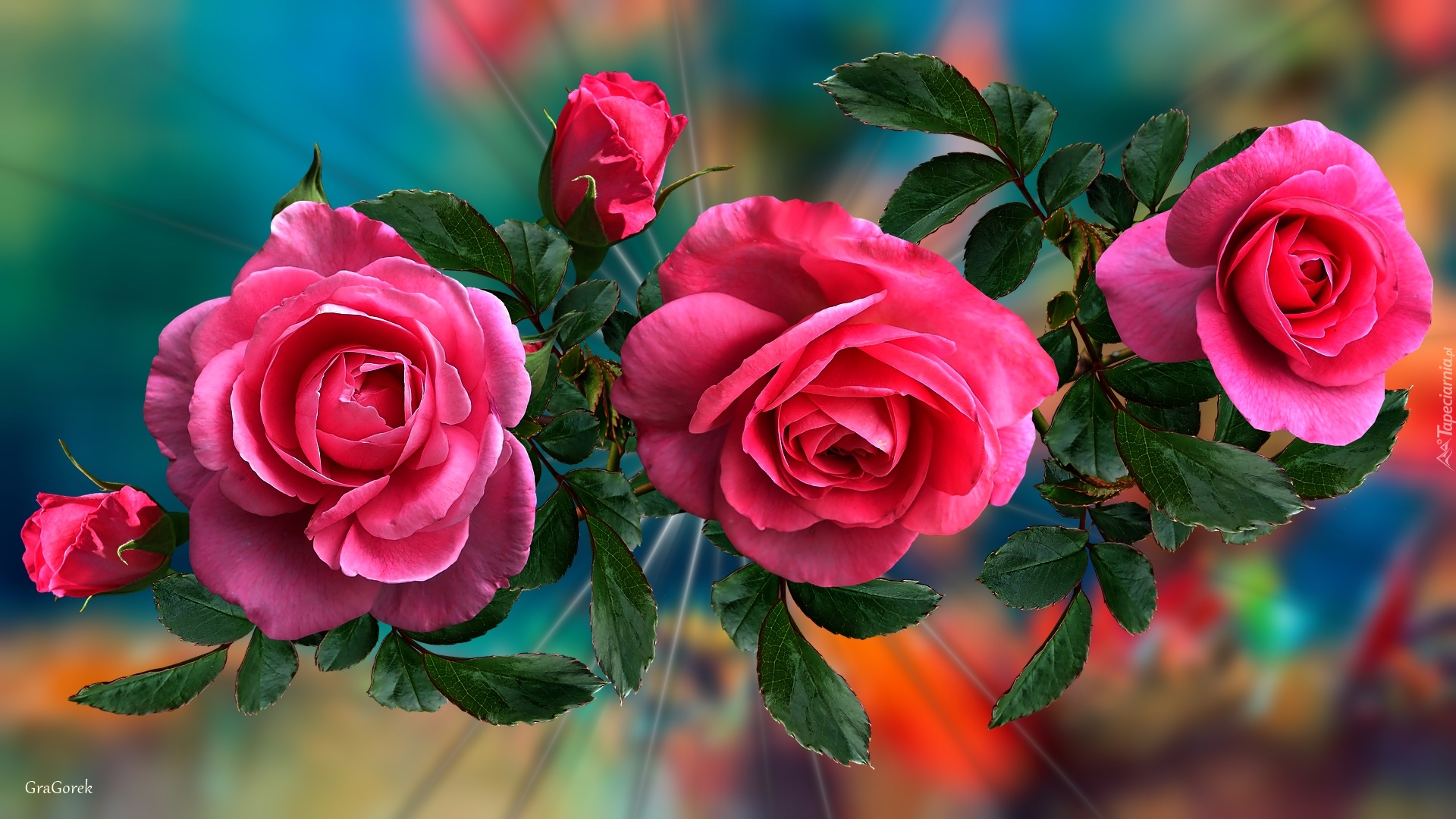 Edytor tapety: Trzy różowe róże z pąkami w grafice