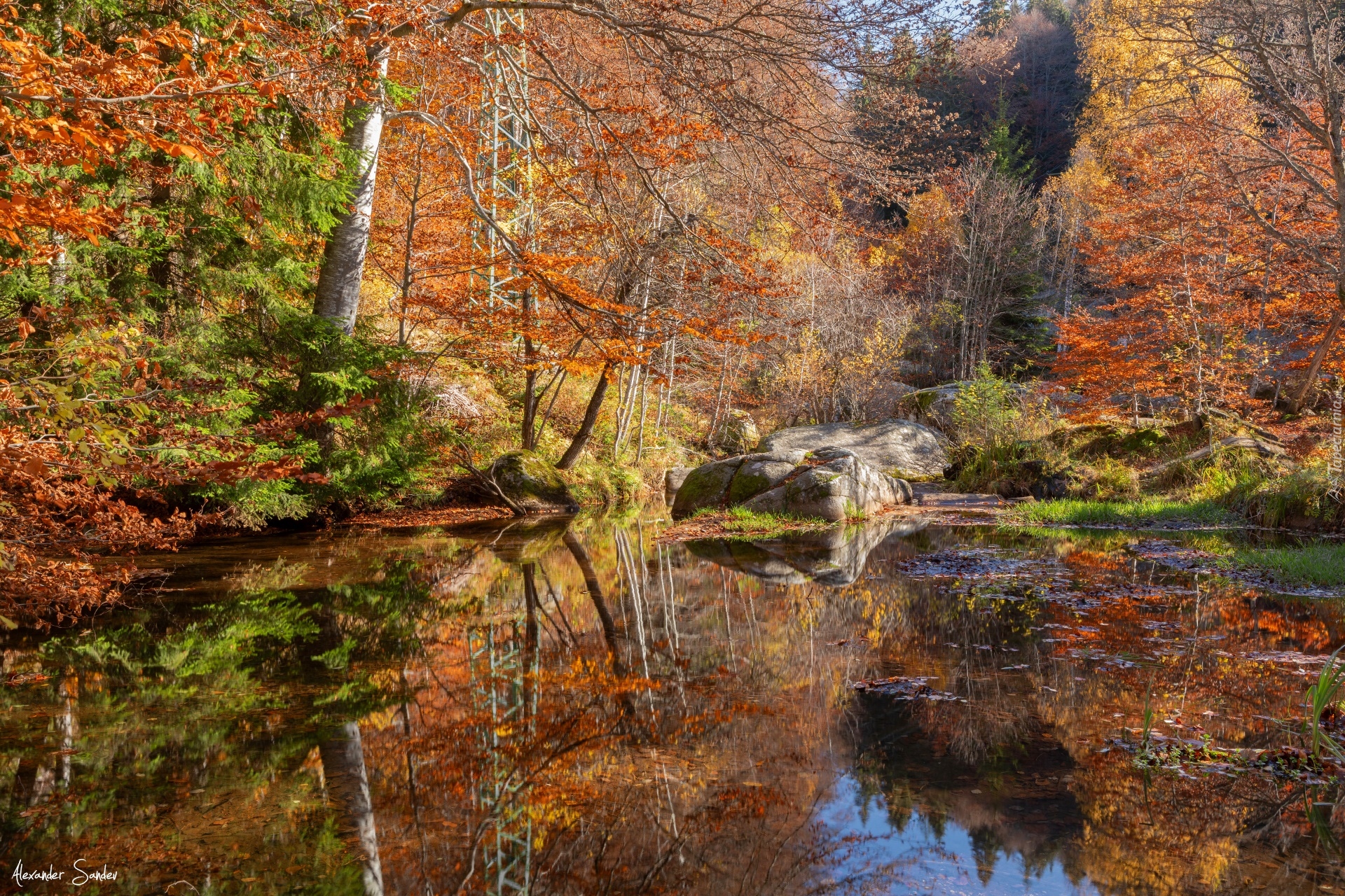 Edytor tapety: Skały i jesienne drzewa nad leśnym stawem