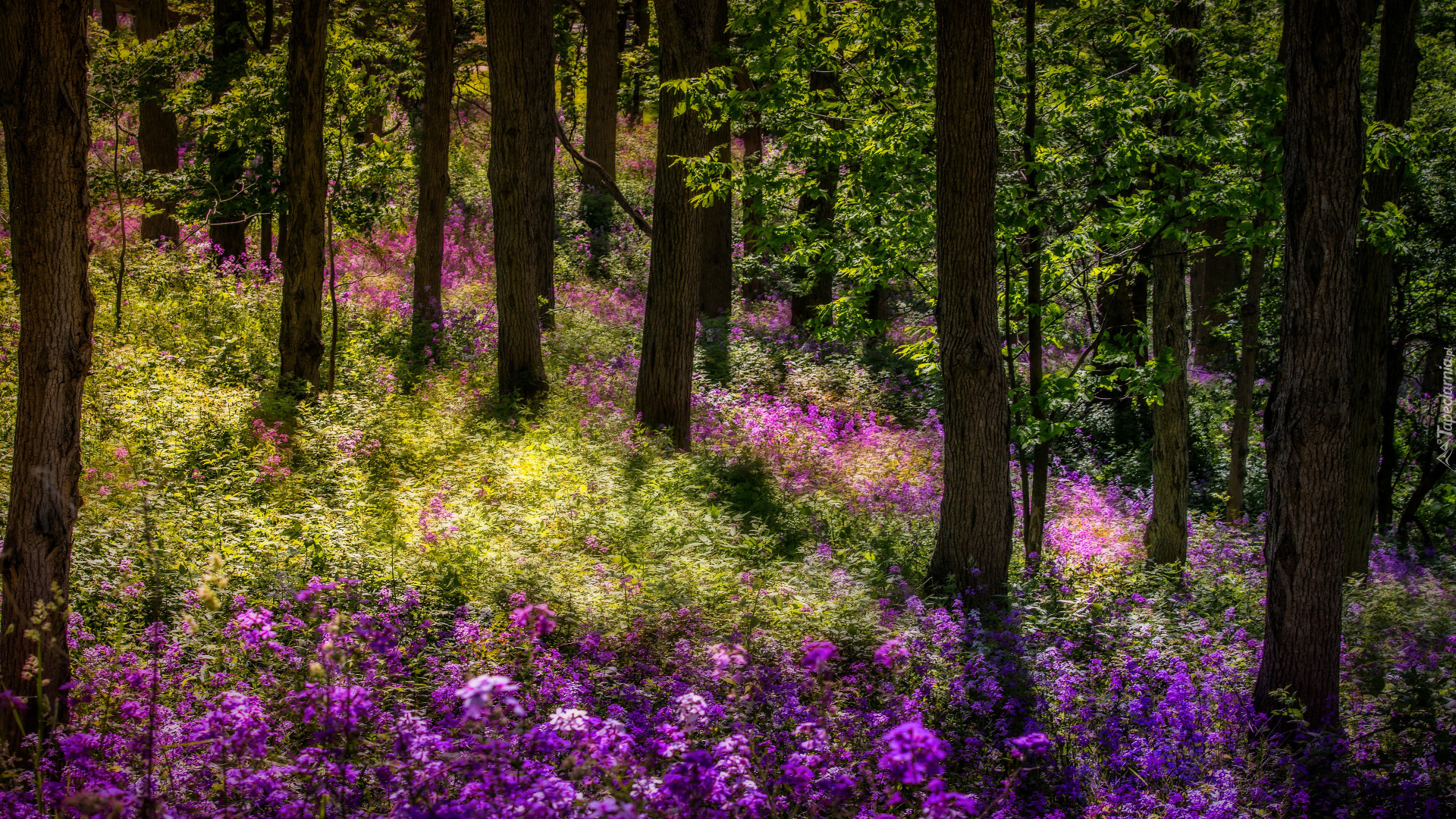 Edytor tapety: Fioletowe kwiaty pod drzewami w słonecznym lesie