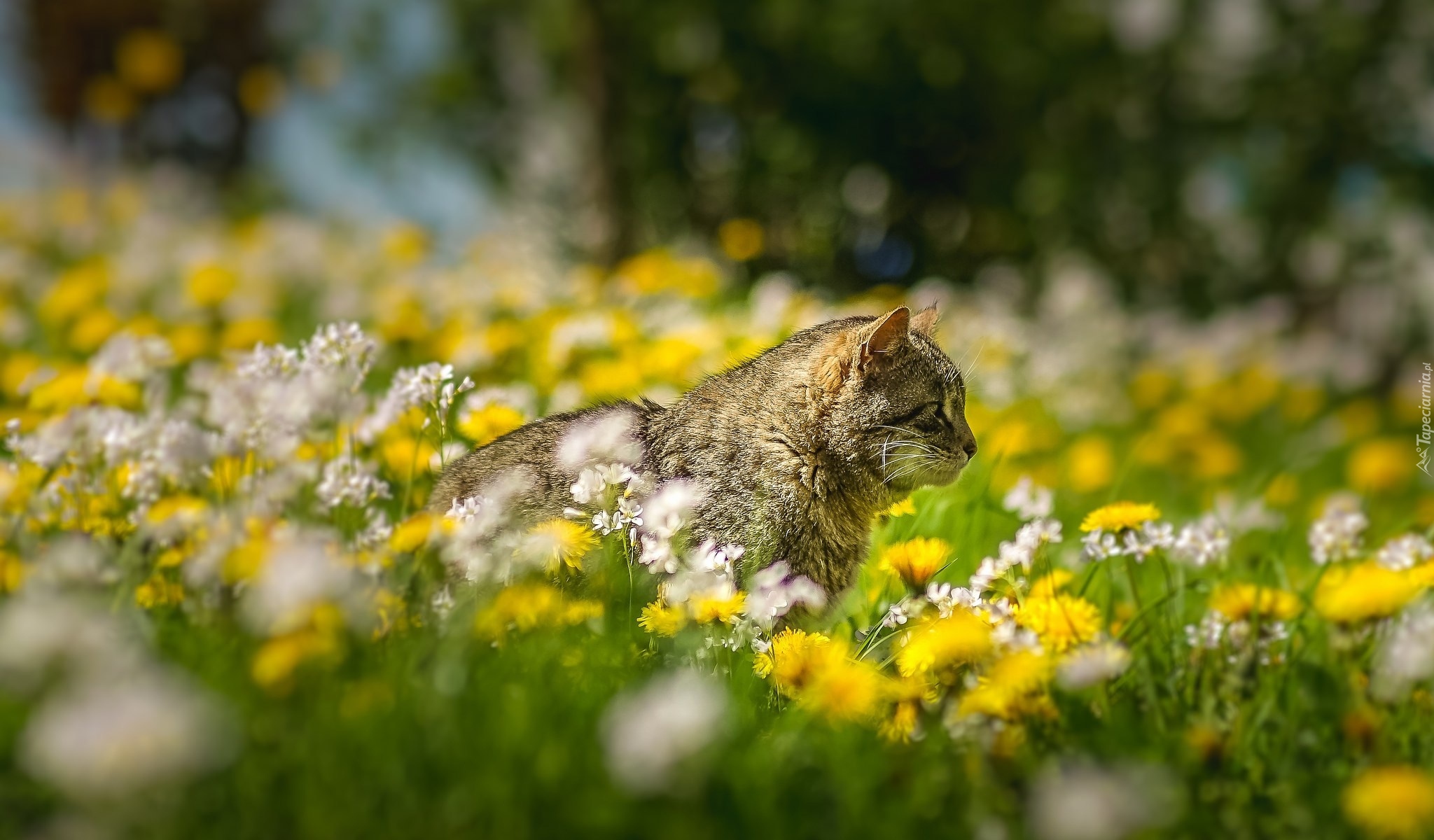 Edytor tapety: Bury kot na kwiecistej łące
