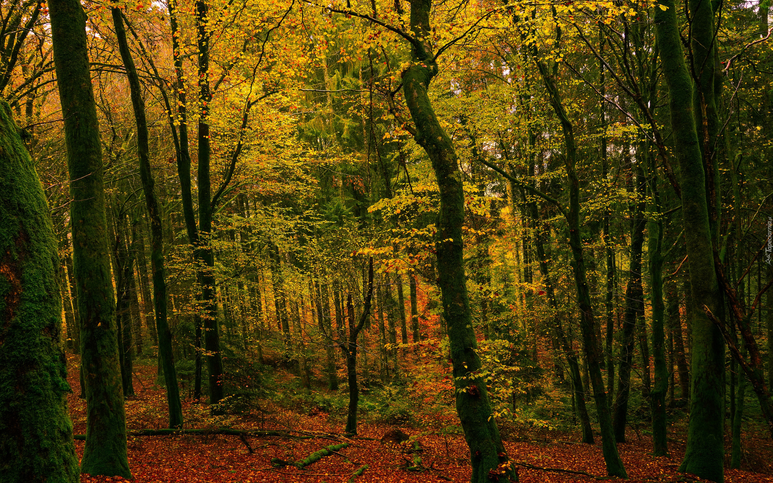Edytor tapety: Opadłe liście pod drzewami w liściastym lesie