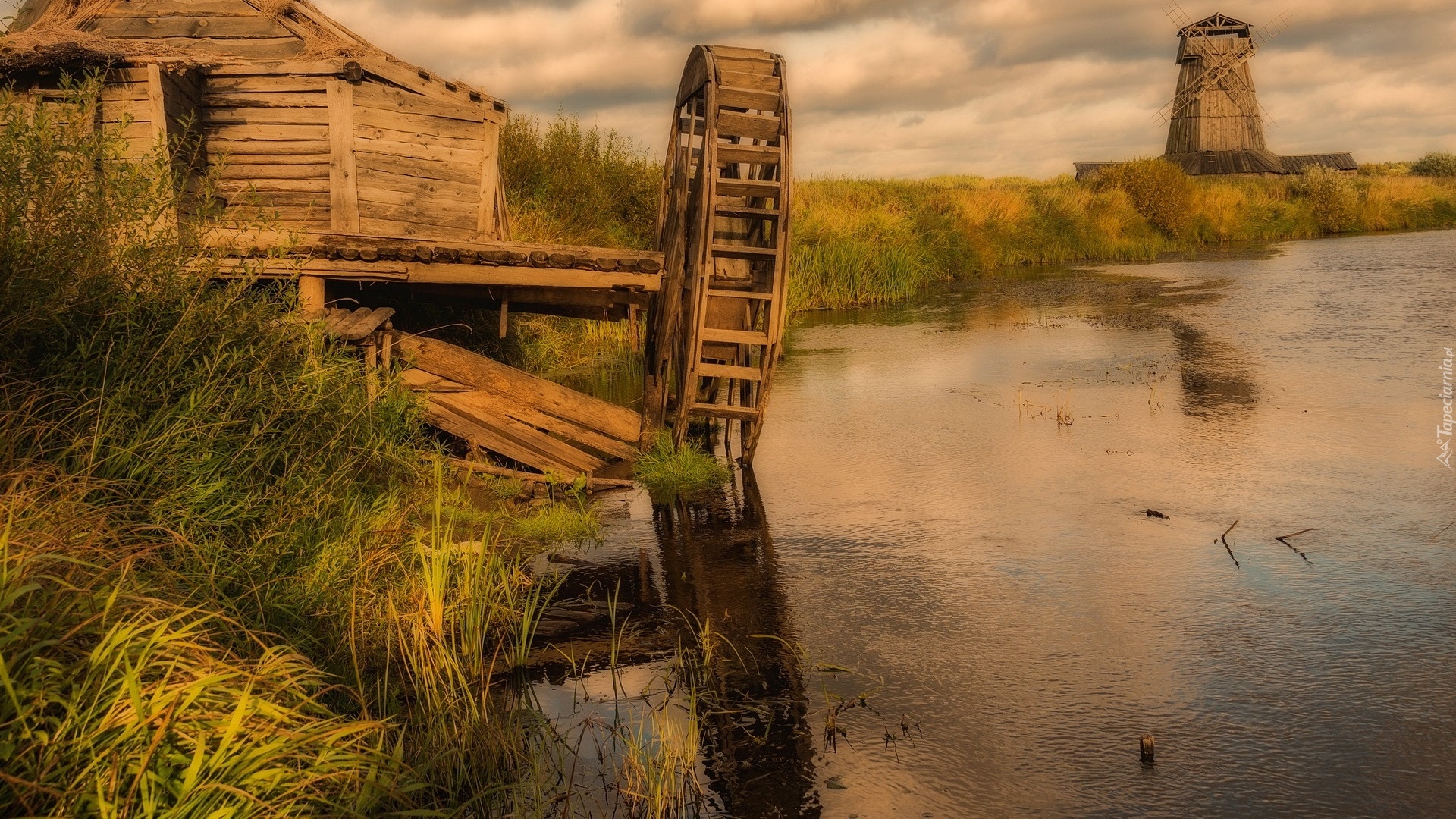 Edytor tapety: Stary młyn wodny i wiatrak na brzegu rzeki