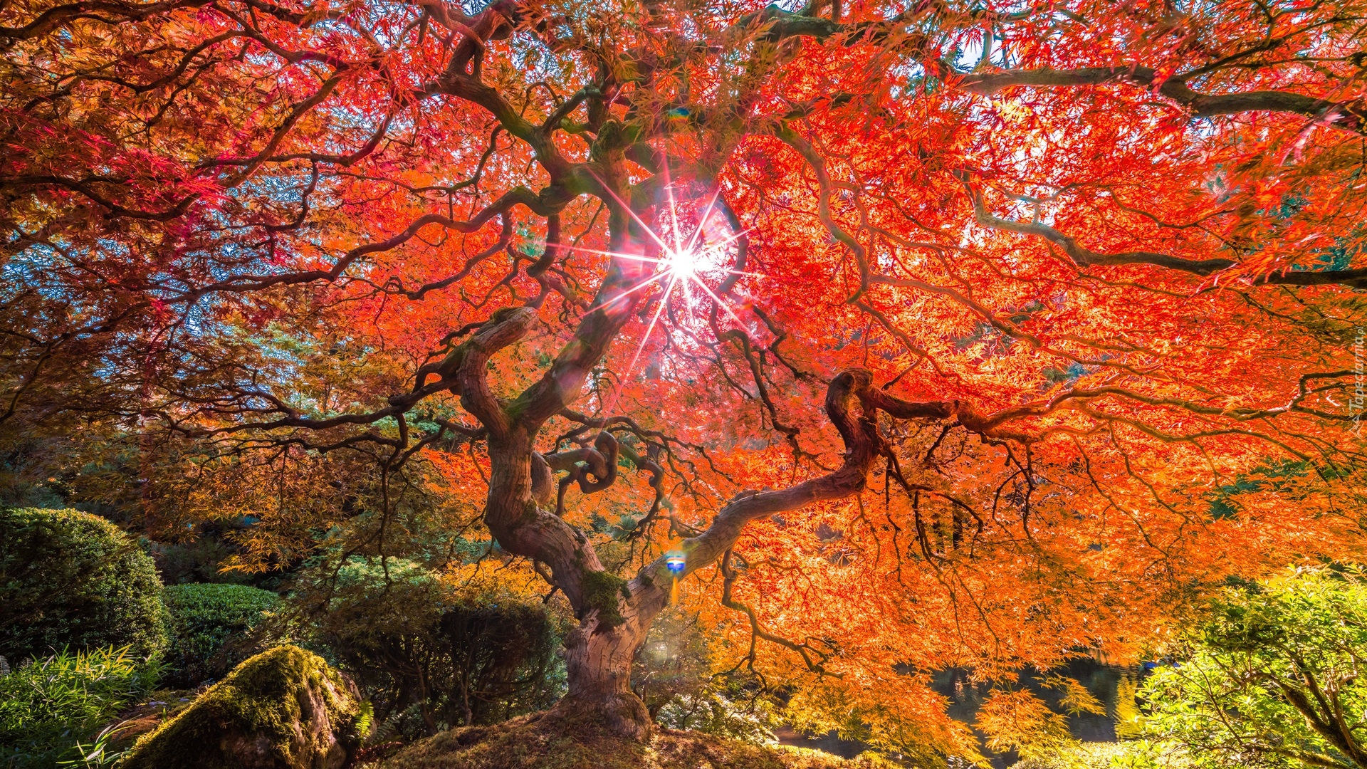 Edytor tapety: Promienie słońca pomiędzy gałęziami klonu