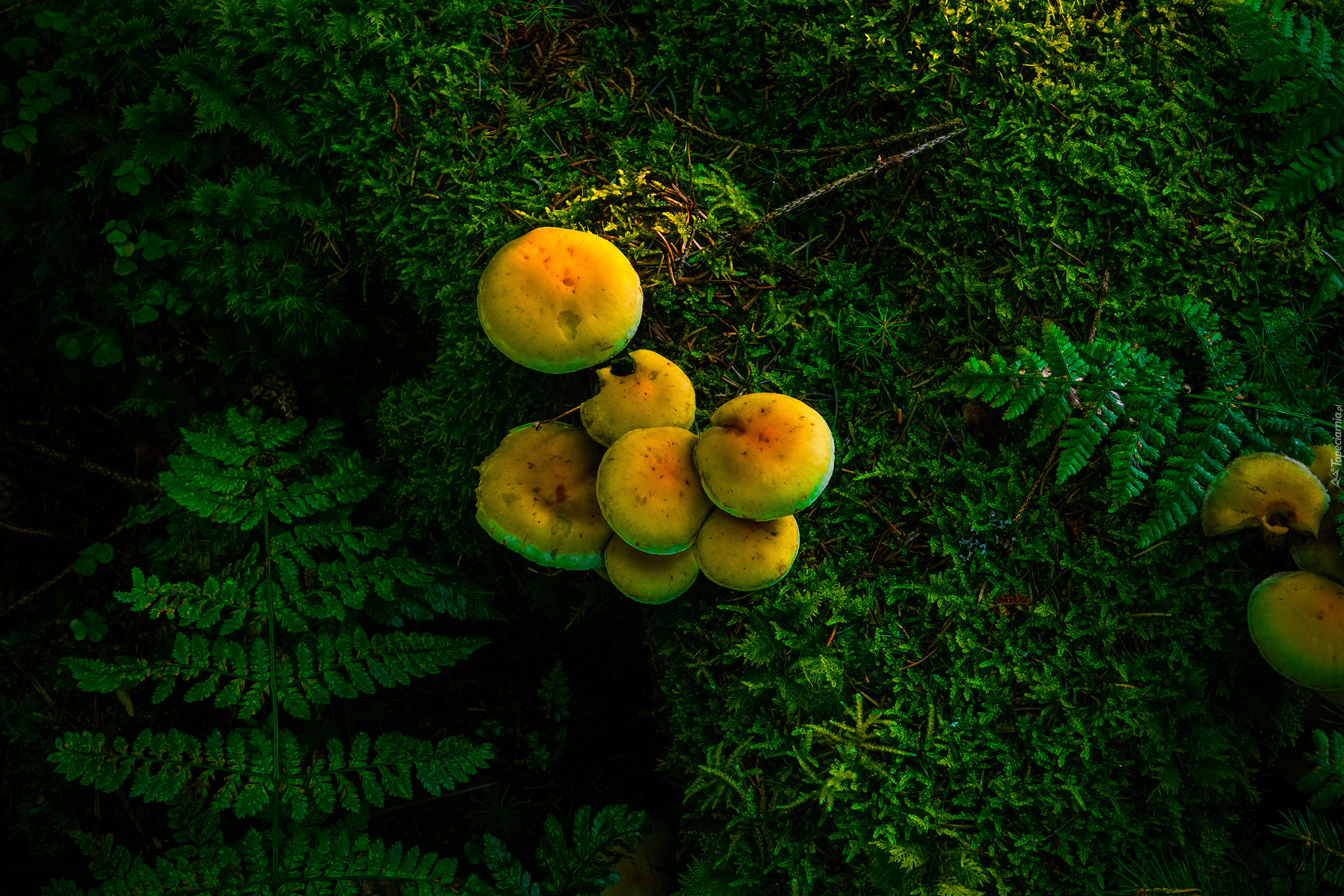 Edytor tapety: Grzyby na mchu obok paproci