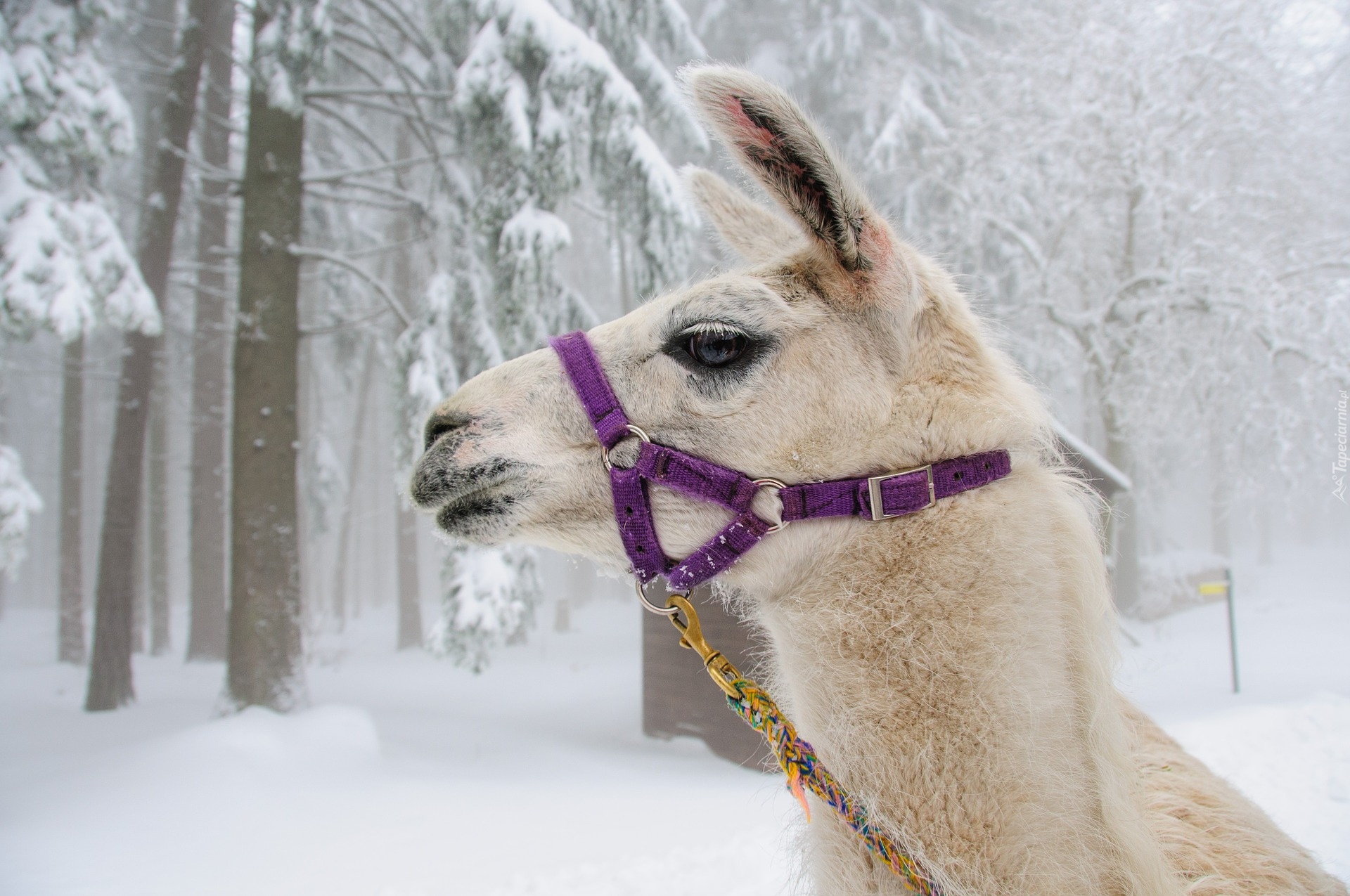 Edytor tapety: Głowa lamy z uzdą na tle zimowego lasu
