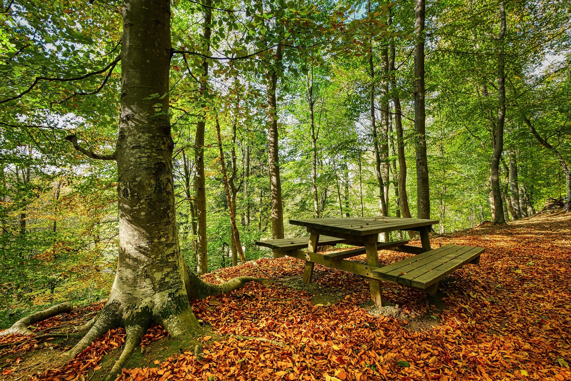 Edytor tapety: Ławka pod drzewami na opadłych liściach