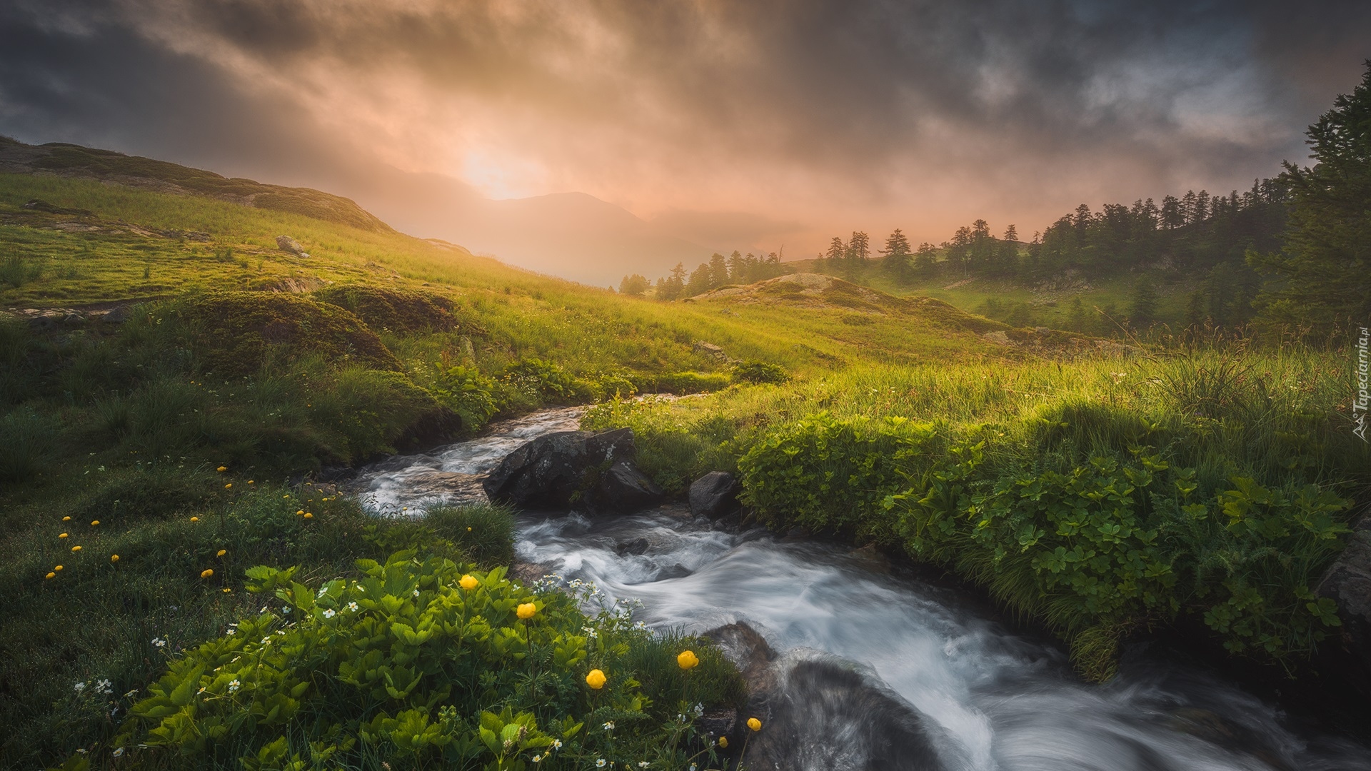 Edytor tapety: Kwiaty przy brzegu strumyka na łące
