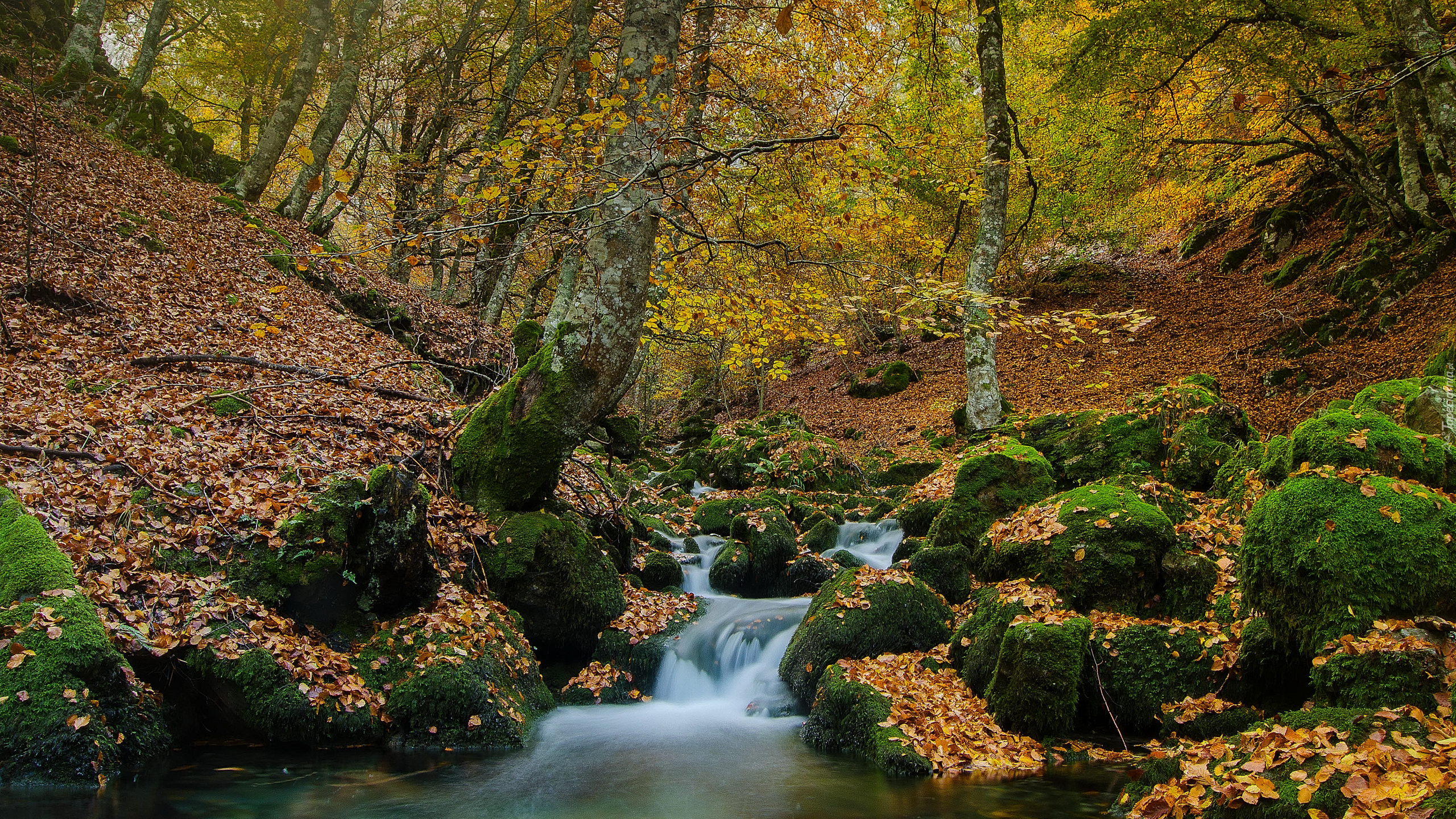 Edytor tapety: Strumyk i omszone kamienie w jesiennym lesie