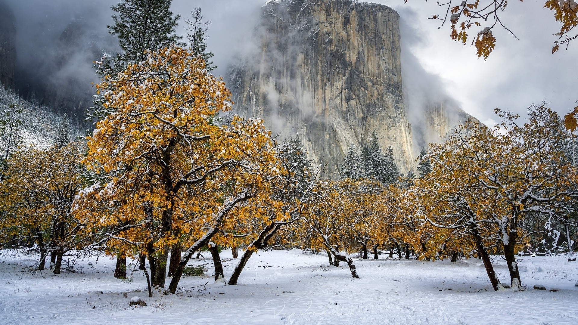 Edytor tapety: Jesienne ośnieżone drzewa na tle góry we mgle