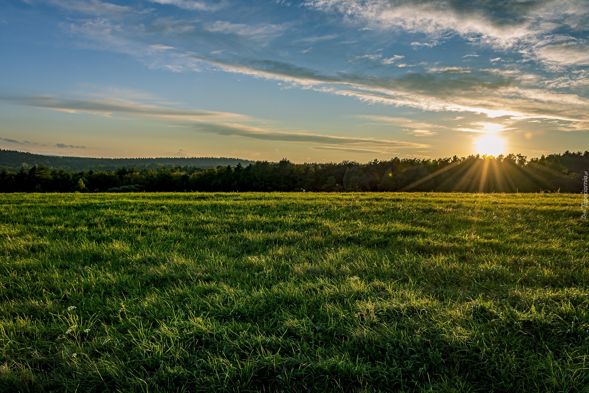 Edytor tapety: Łąka i las w oddali o wschodzie słońca