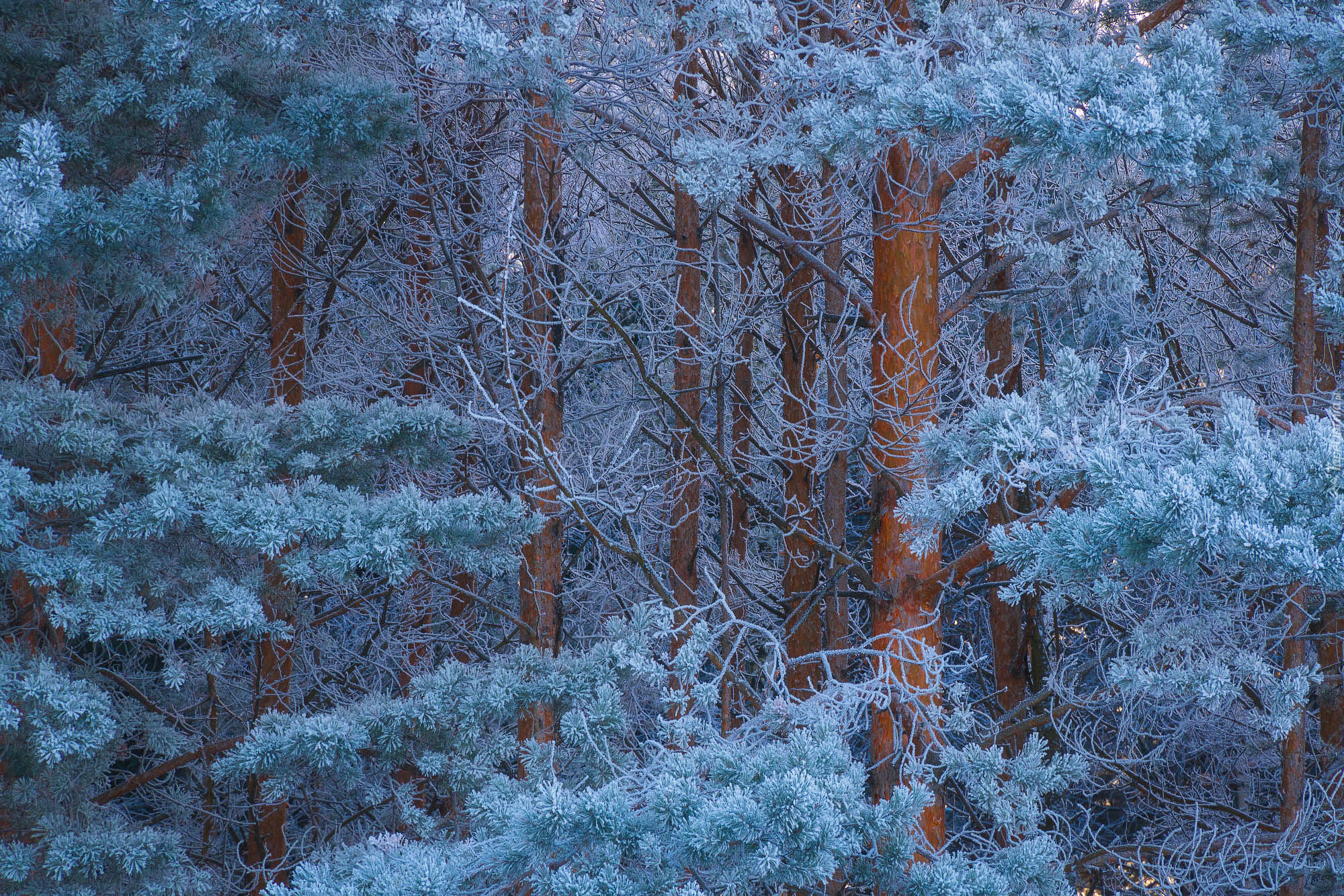 Edytor tapety: Oszronione drzewa iglaste w lesie