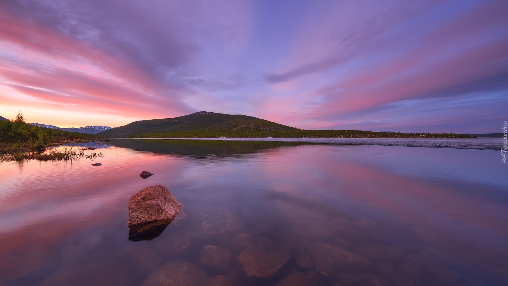 Edytor tapety: Kolorowe niebo nad jeziorem i górą