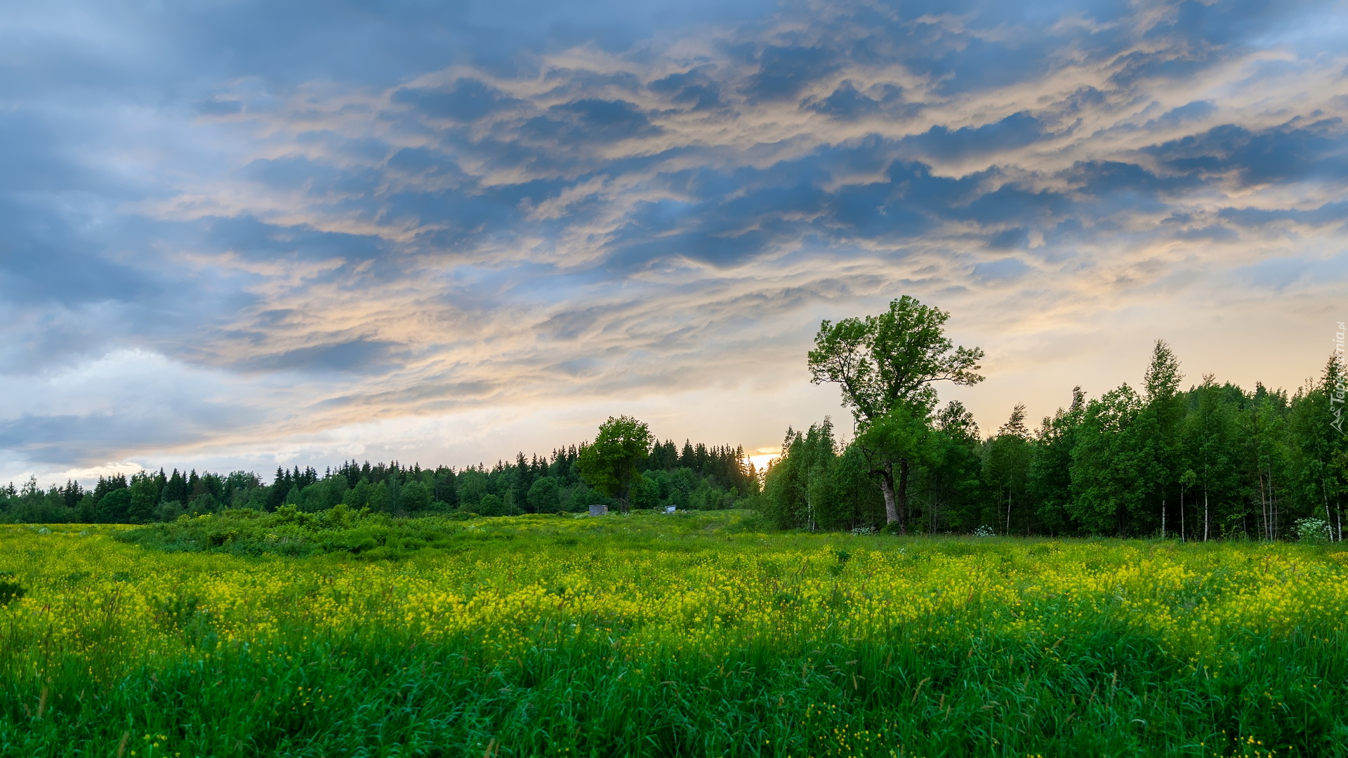 Edytor tapety: Chmury nad drzewami przy zielonej łące