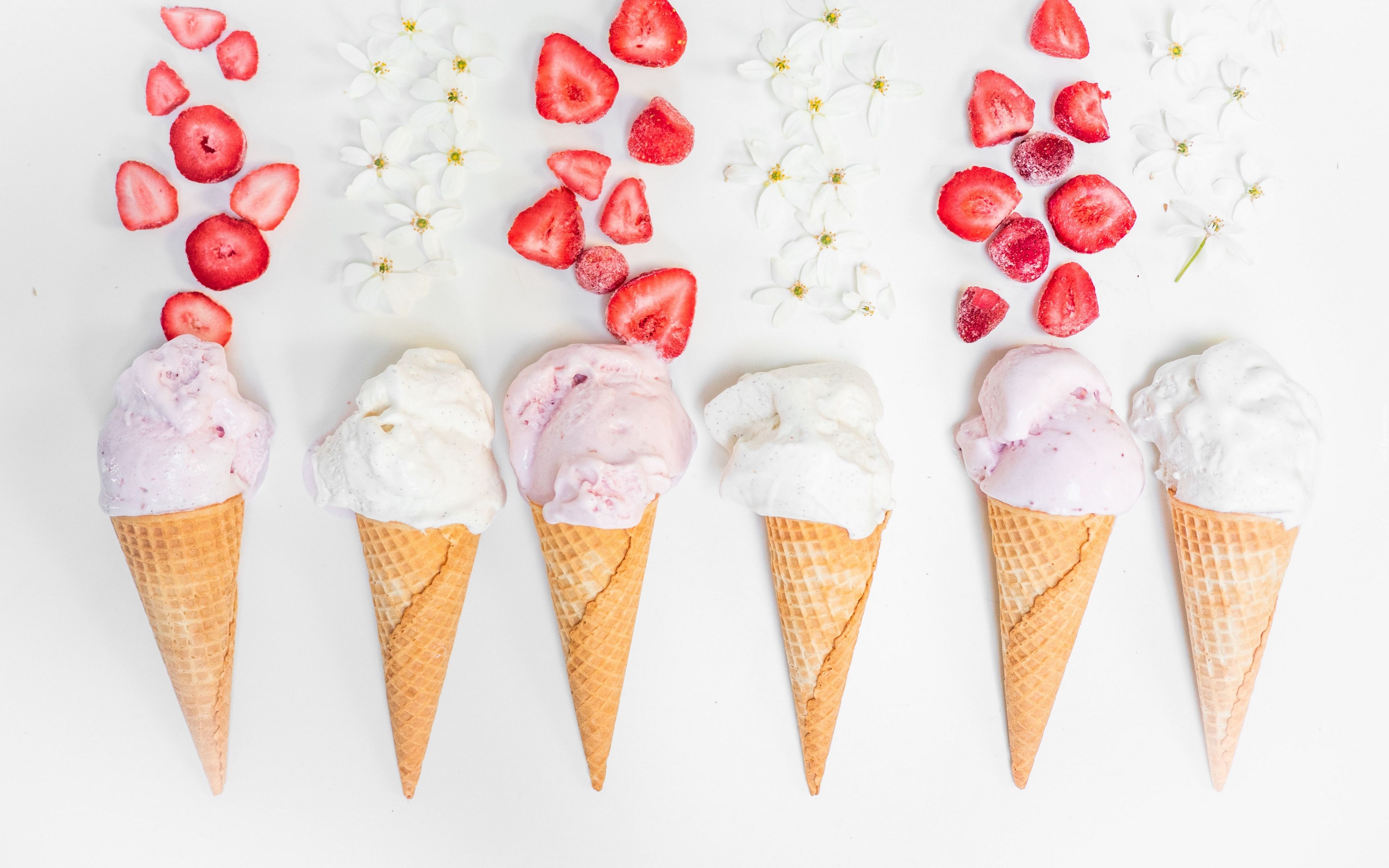 Edytor tapety: Truskawki i białe kwiatki przy lodach w rożkach