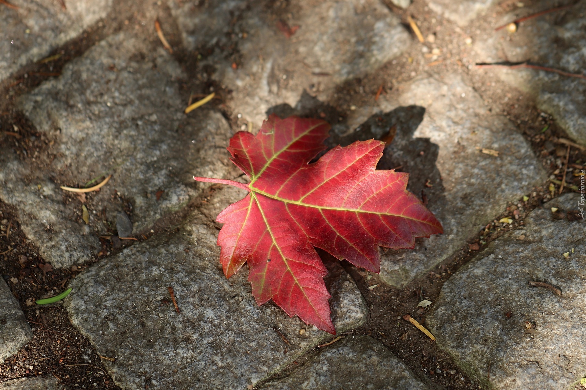 Edytor tapety: Czerwony liść klonu na kostkach brukowych