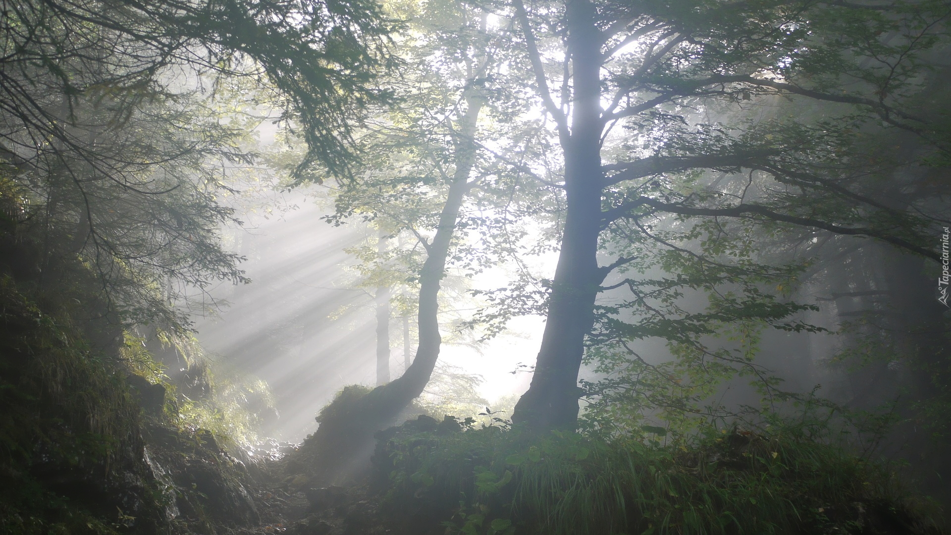 Edytor tapety: Promienie słońca między drzewami w zamglonym lesie