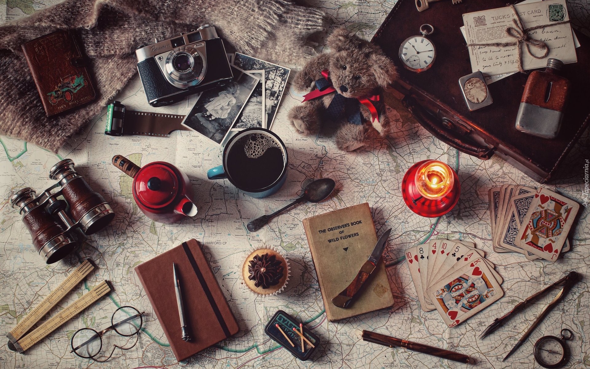 Edytor tapety: Pluszowy miś pośród akcesoriów podróżnika