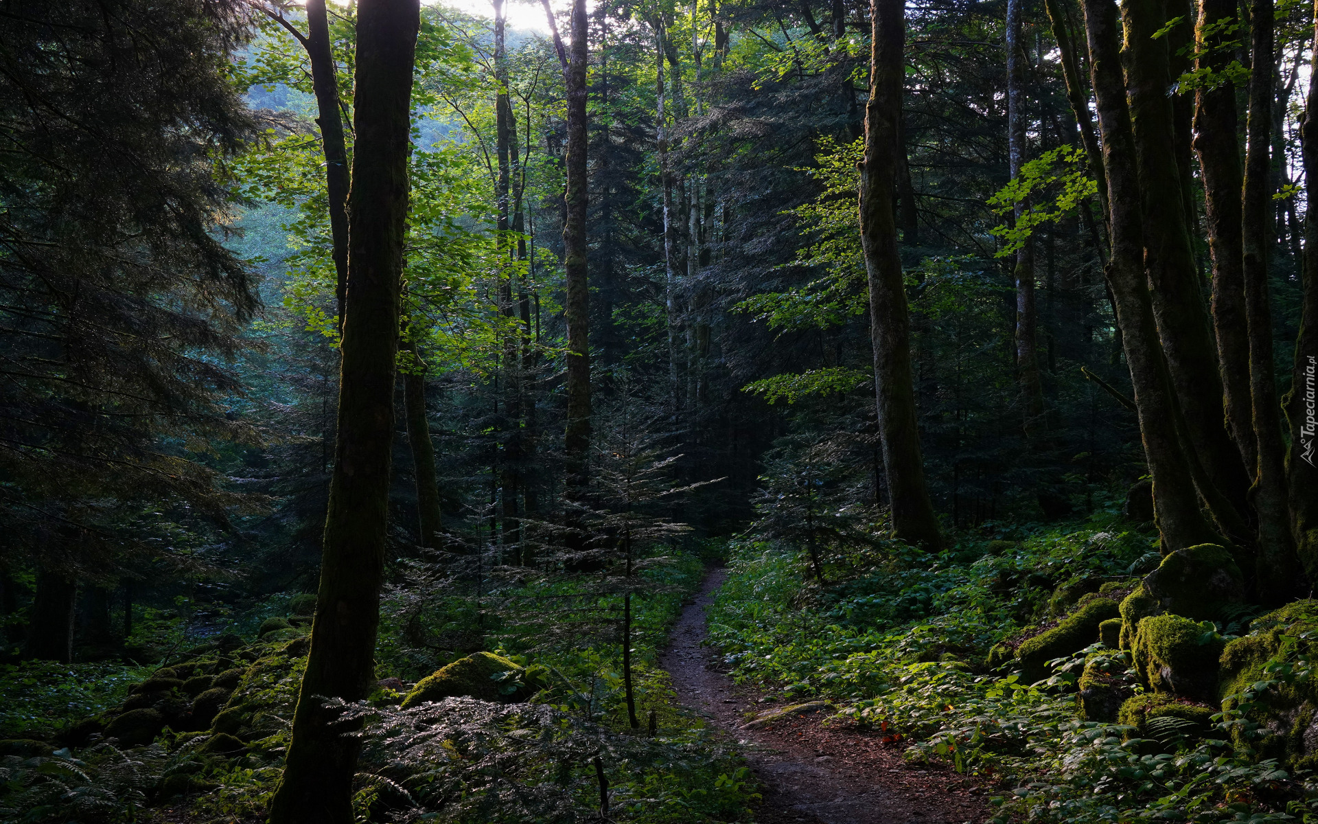 Edytor tapety: Omszałe kamienie i zarośla przy leśnej ścieżce