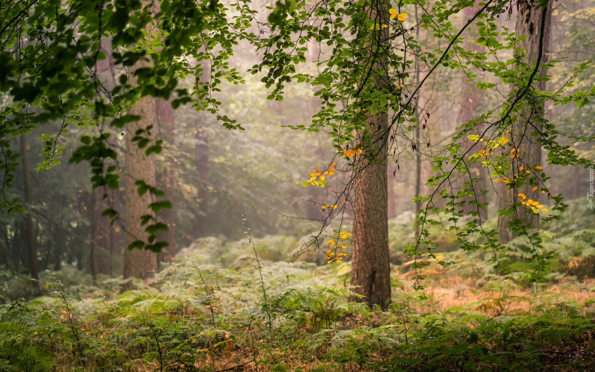Edytor tapety: Gałązki z zielonymi liśćmi na tle lasu