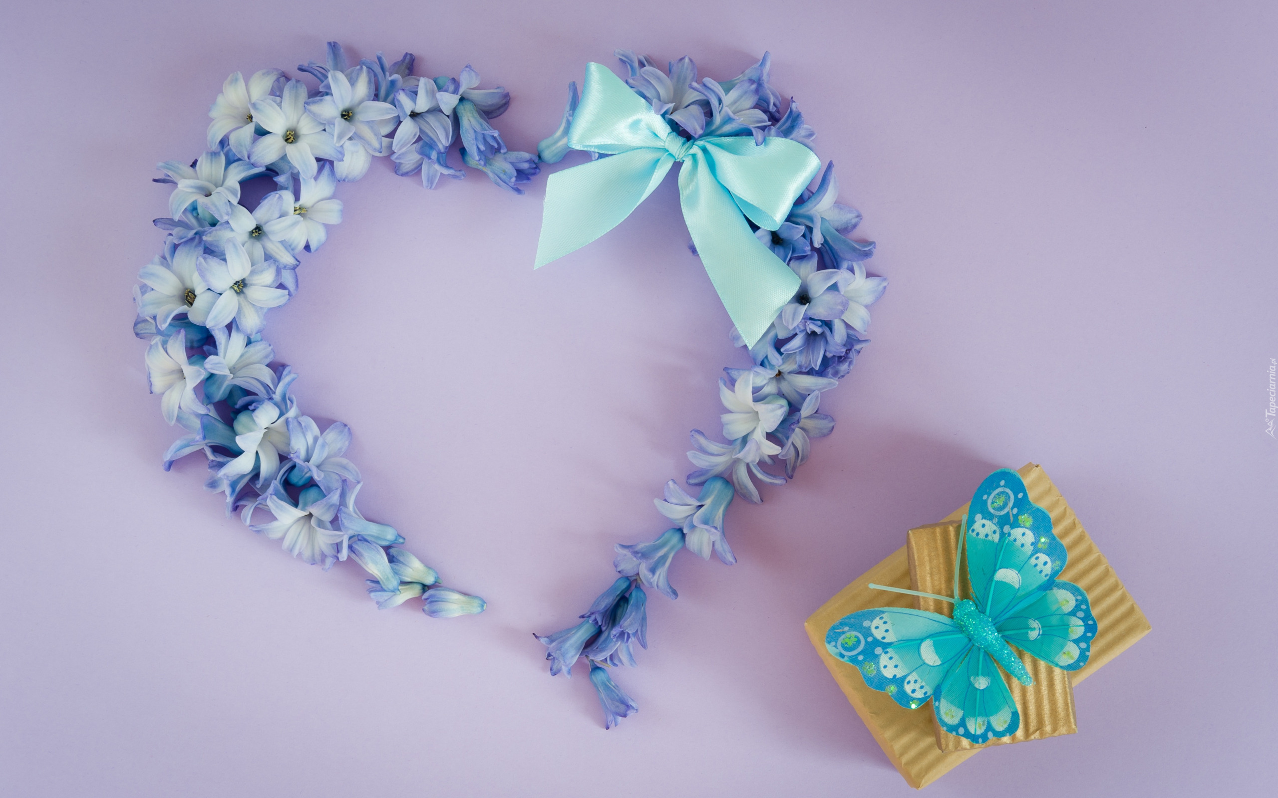 Edytor tapety: Niebieskie kwiatowe serduszko przy prezencie z motylkiem